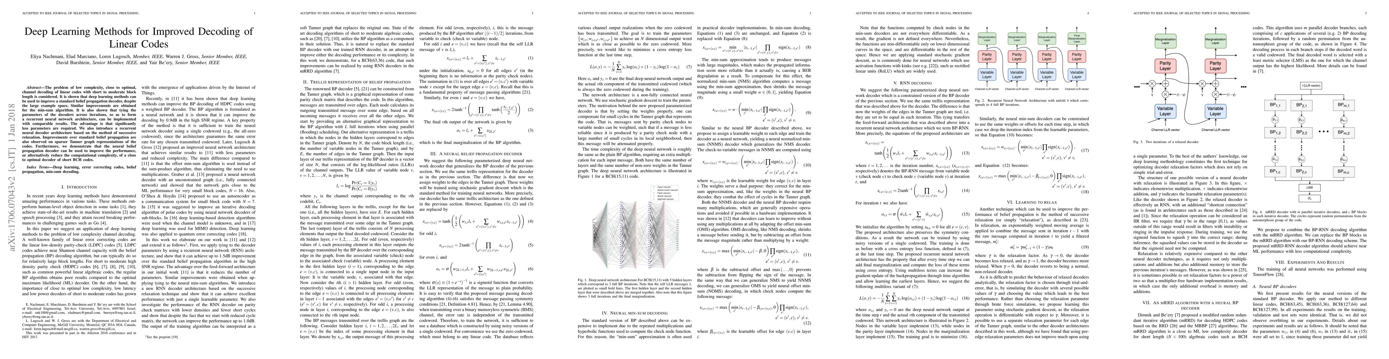 Deep learning improves channel decoding of linear codes with short to moderate block length, offering lower complexity and comparable performance to traditional methods.