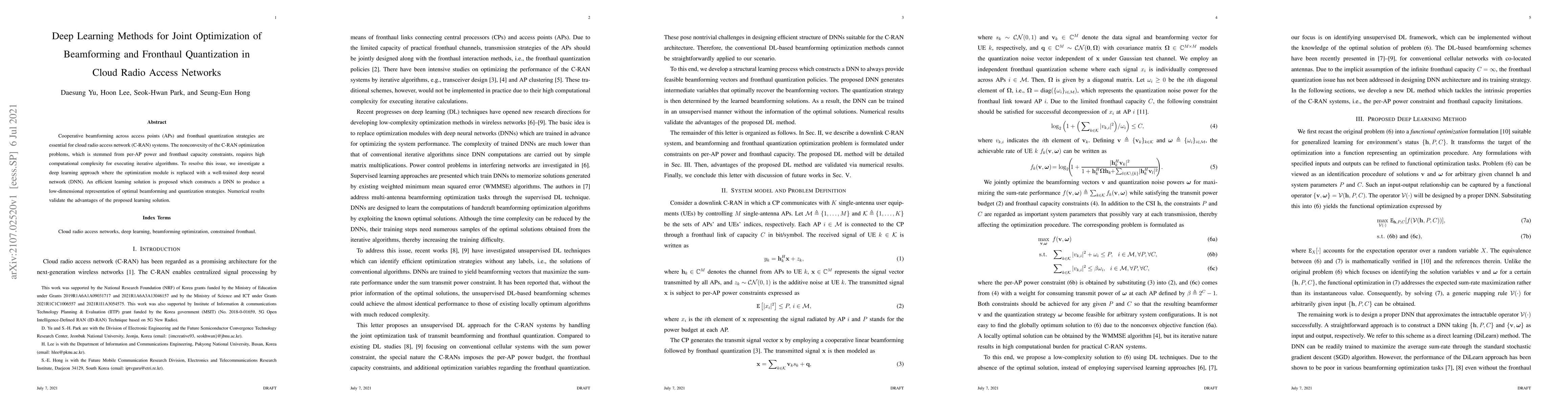 This paper proposes a deep learning method to optimize beamforming and fronthaul quantization in cloud radio access networks (C-RAN) by replacing traditional iterative algorithms with a trained deep neural network (DNN). The DNN provides an efficient low-dimensional representation of optimal strategies, demonstrating advantages over conventional methods.