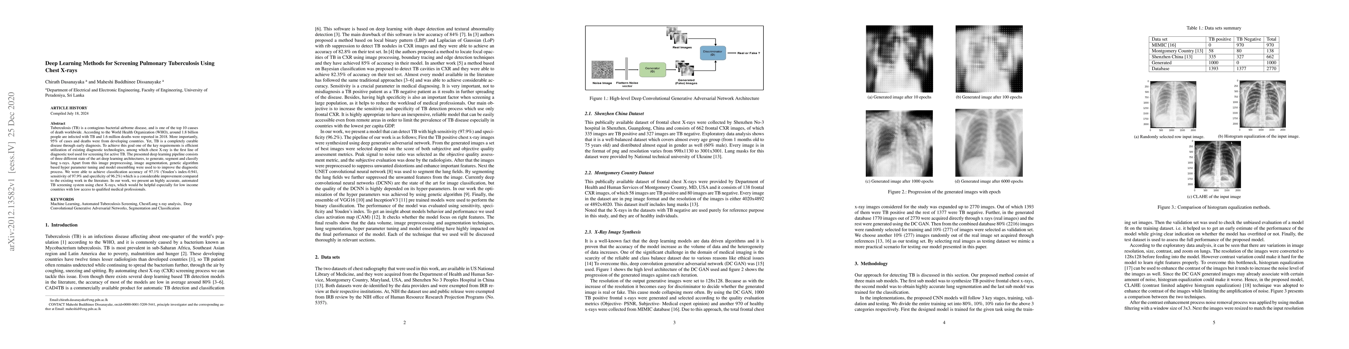 Tuberculosis (TB) is a contagious bacterial airborne disease, and is one of the top 10 causes of death worldwide. According to the World Health Organization (WHO), around 1.8 billion people are infected with TB and 1.6 million deaths were reported in 2018. More importantly,95% of cases and deaths were from developing countries. Yet, TB is a completely curable disease through early diagnosis. To achieve this goal one of the key requirements is efficient utilization of existing diagnostic technologies, among which chest X-ray is the first line of diagnostic tool used for screening for active TB. The presented deep learning pipeline consists of three different state of the art deep learning architectures, to generate, segment and classify lung X-rays. Apart from this image preprocessing, image augmentation, genetic algorithm based hyper parameter tuning and model ensembling were used to to improve the diagnostic process. We were able to achieve classification accuracy of 97.1% (Youden's index-0.941,sensitivity of 97.9% and specificity of 96.2%) which is a considerable improvement compared to the existing work in the literature. In our work, we present an highly accurate, automated TB screening system using chest X-rays, which would be helpful especially for low income countries with low access to qualified medical professionals.