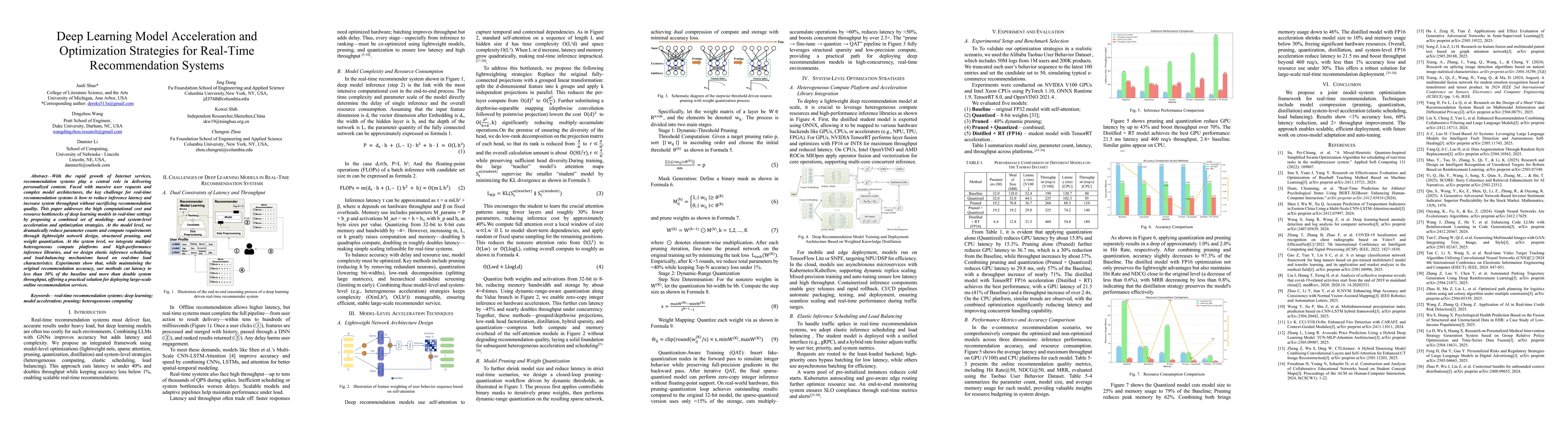 With the rapid growth of Internet services, recommendation systems play a central role in delivering personalized content. Faced with massive user requests and complex model architectures, the key challenge for real-time recommendation systems is how to reduce inference latency and increase system throughput without sacrificing recommendation quality. This paper addresses the high computational cost and resource bottlenecks of deep learning models in real-time settings by proposing a combined set of modeling- and system-level acceleration and optimization strategies. At the model level, we dramatically reduce parameter counts and compute requirements through lightweight network design, structured pruning, and weight quantization. At the system level, we integrate multiple heterogeneous compute platforms and high-performance inference libraries, and we design elastic inference scheduling and load-balancing mechanisms based on real-time load characteristics. Experiments show that, while maintaining the original recommendation accuracy, our methods cut latency to less than 30% of the baseline and more than double system throughput, offering a practical solution for deploying large-scale online recommendation services.