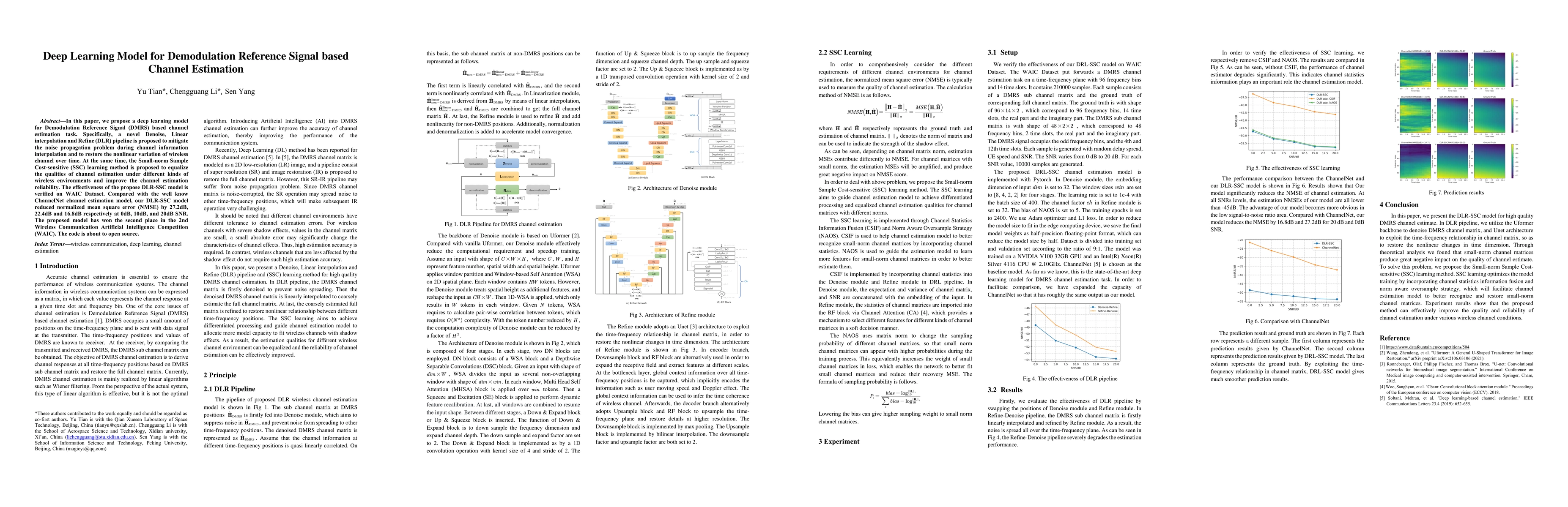 In this paper, we propose a deep learning model for Demodulation Reference Signal (DMRS) based channel estimation task. Specifically, a novel Denoise, Linear interpolation and Refine (DLR) pipeline is proposed to mitigate the noise propagation problem during channel information interpolation and to restore the nonlinear variation of wireless channel over time. At the same time, the Small-norm Sample Cost-sensitive (SSC) learning method is proposed to equalize the qualities of channel estimation under different kinds of wireless environments and improve the channel estimation reliability. The effectiveness of the propose DLR-SSC model is verified on WAIC Dataset. Compared with the well know ChannelNet channel estimation model, our DLR-SSC model reduced normalized mean square error (NMSE) by 27.2dB, 22.4dB and 16.8dB respectively at 0dB, 10dB, and 20dB SNR. The proposed model has won the second place in the 2nd Wireless Communication Artificial Intelligence Competition (WAIC). The code is about to open source.
