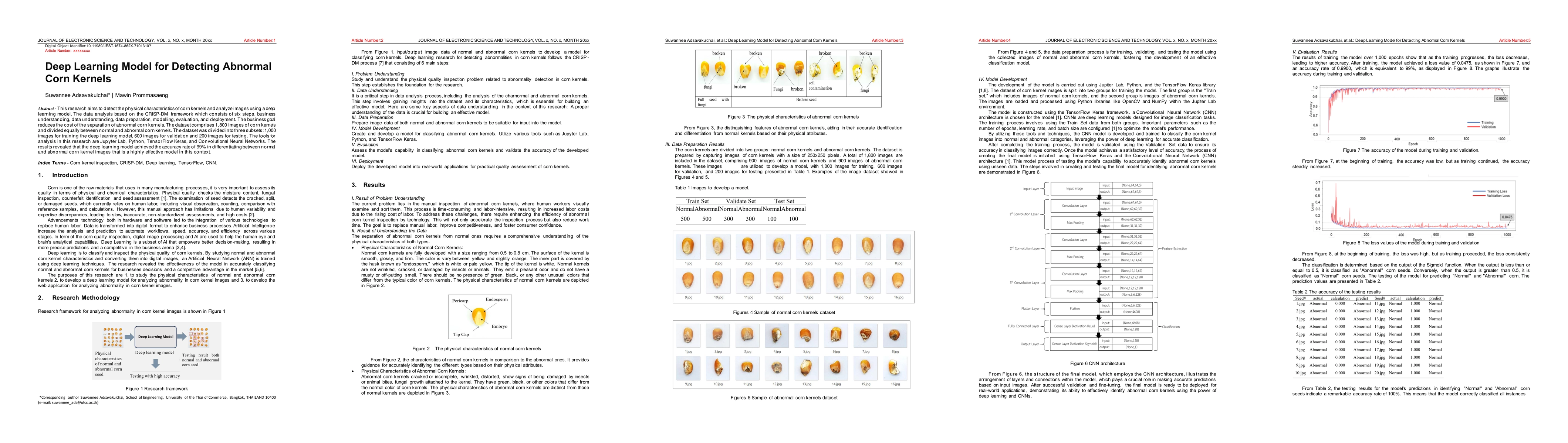 This study developed a deep learning model using Convolutional Neural Networks to detect abnormal corn kernels from 1,800 images, achieving 99% accuracy and aiming to reduce separation costs. The research followed the CRISP-DM framework and utilized Python, TensorFlow Keras, and Jupyter Lab for analysis.