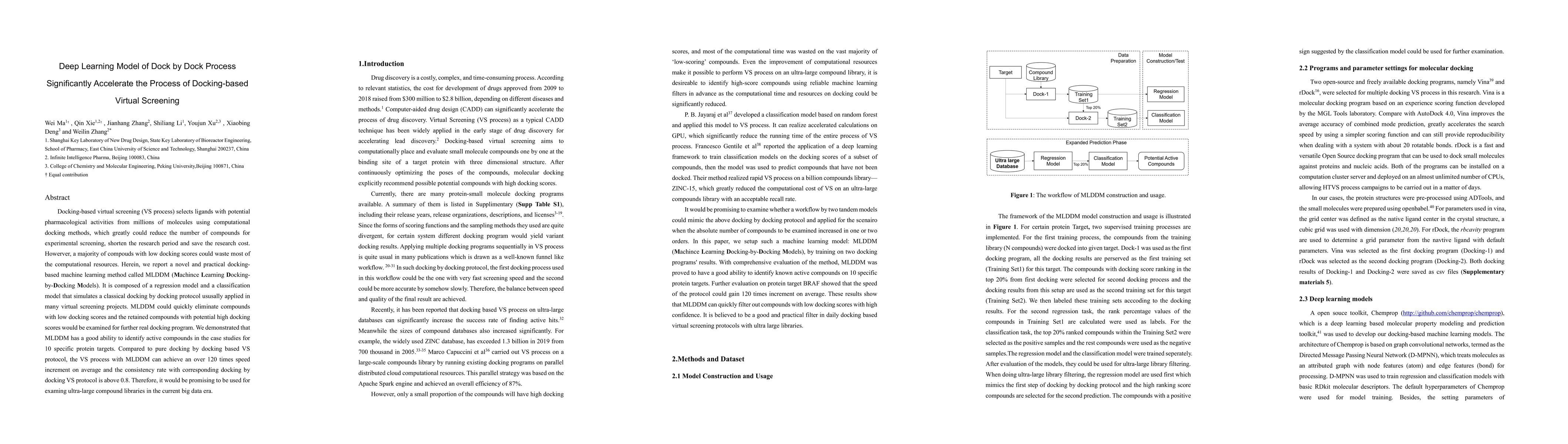 This paper introduces MLDDM, a machine learning model that accelerates docking-based virtual screening by quickly eliminating low-scoring compounds, significantly speeding up the process while maintaining high accuracy. The method achieved over 120 times faster screening with 80% consistency compared to traditional docking methods.