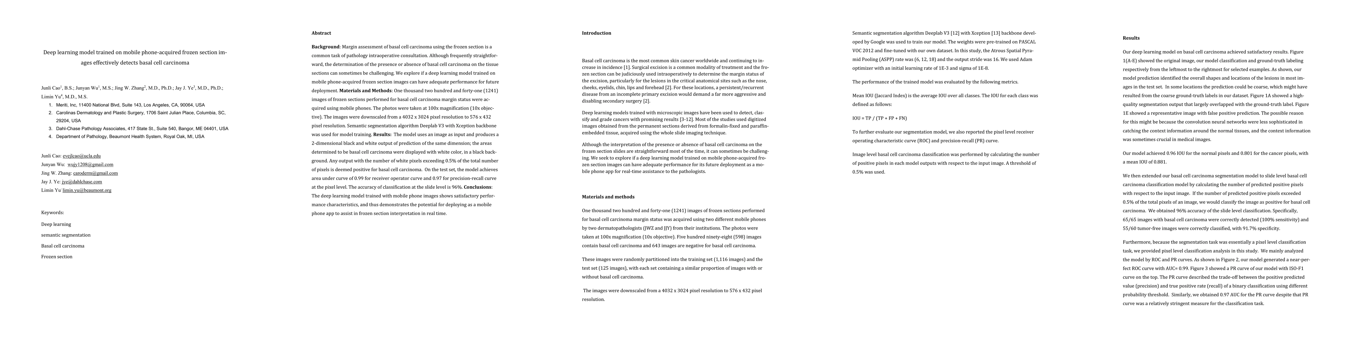 A deep learning model trained on mobile phone-acquired frozen section images for basal cell carcinoma detection shows high accuracy, achieving 96% classification accuracy at the slide level and promising performance metrics on receiver operator and precision-recall curves. This suggests potential for real-time intraoperative assistance via mobile phone apps.