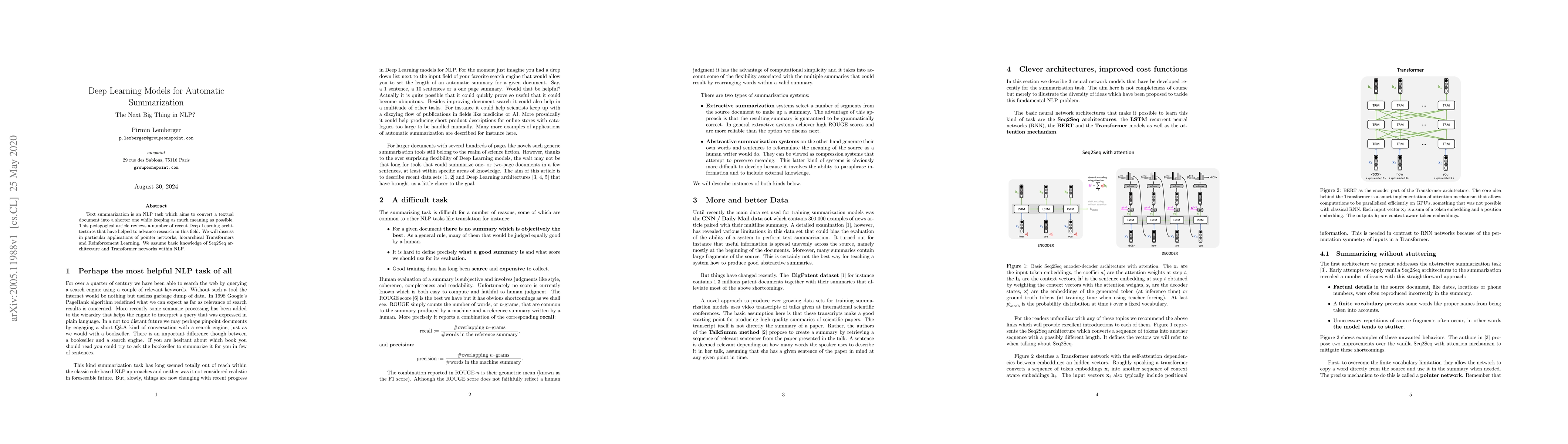 Summary: This paper reviews recent advancements in deep learning models for automatic text summarization, focusing on pointer networks, hierarchical Transformers, and reinforcement learning, assuming familiarity with Seq2Seq and Transformer architectures in NLP.