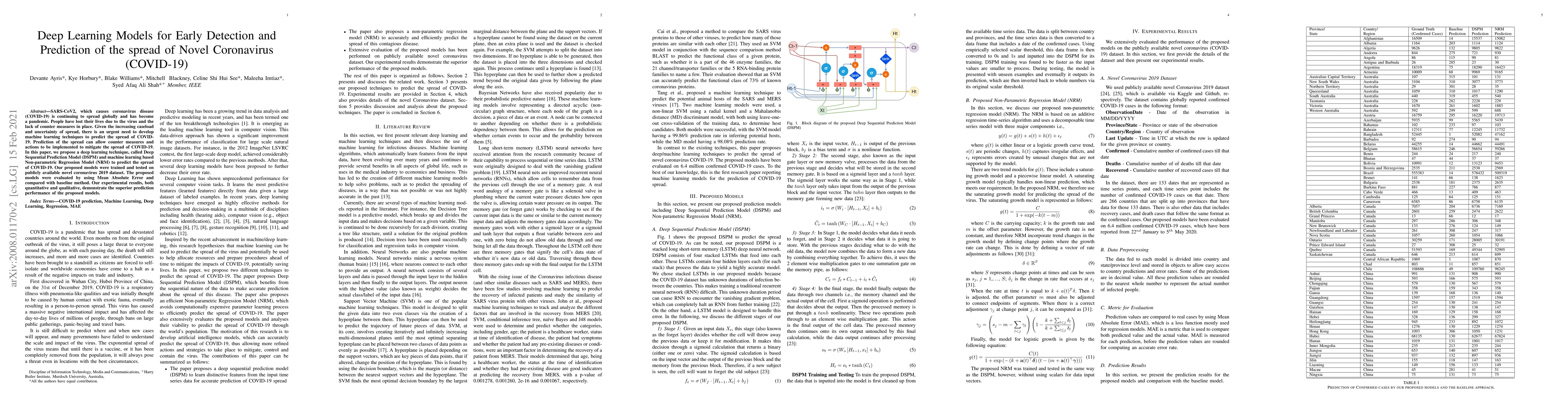 This paper proposes deep learning and machine learning models to predict the spread of COVID-19, using a dataset of 19.53 million confirmed cases. The Deep Sequential Prediction Model (DSPM) and Non-parametric Regression Model (NRM) outperform baseline methods, as shown by superior Mean Absolute Error results.