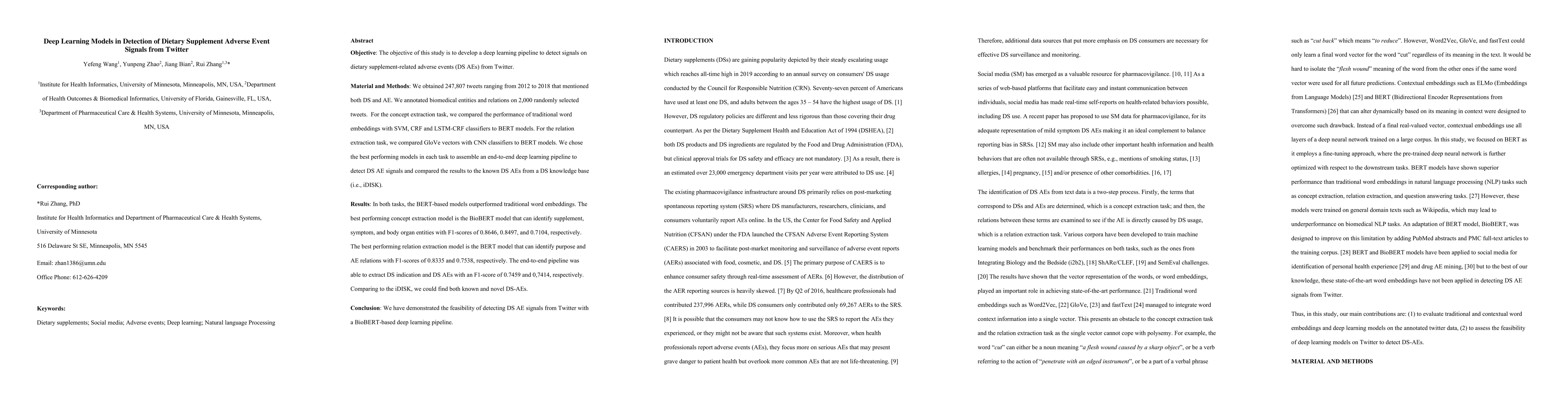 This study developed a deep learning pipeline using BERT models to detect dietary supplement adverse event signals from Twitter. The BioBERT model outperformed traditional methods in concept extraction, while the BERT model excelled in relation extraction, leading to an effective end-to-end pipeline that identified both known and novel adverse events compared to a DS knowledge base.