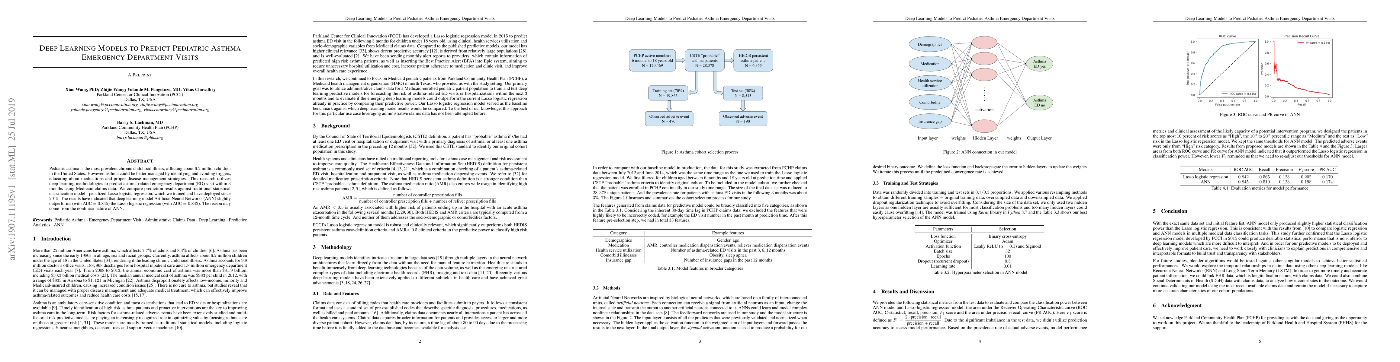 This research applies deep learning models, specifically Artificial Neural Networks (ANN), to predict pediatric asthma-related emergency department visits within three months. The ANN model slightly outperforms the traditional penalized Lasso logistic regression, suggesting the potential benefits of the nonlinear nature of ANN in handling complex data patterns.