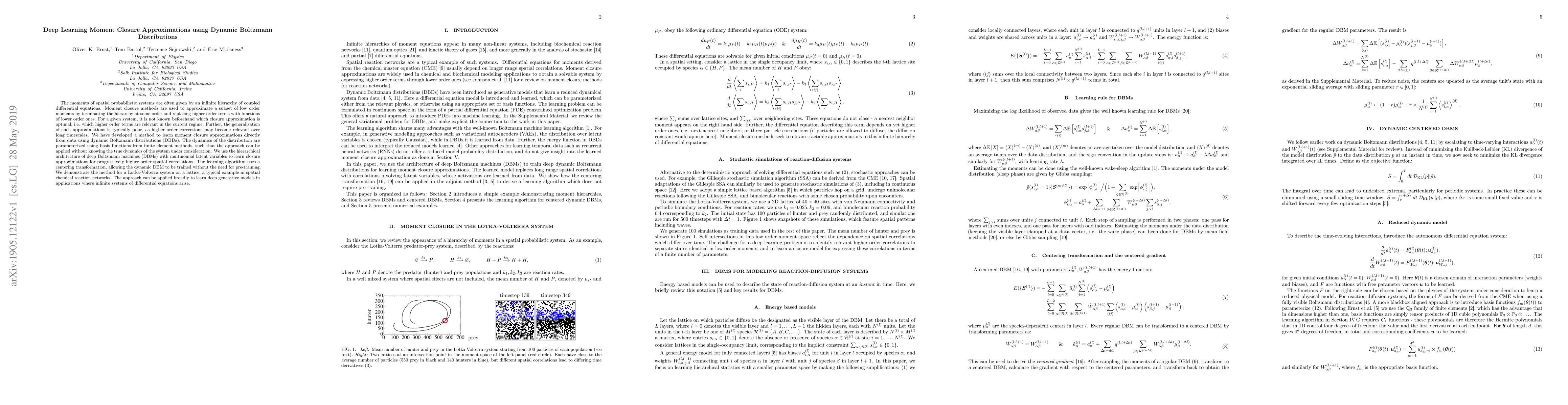 The moments of spatial probabilistic systems are often given by an infinite hierarchy of coupled differential equations. Moment closure methods are used to approximate a subset of low order moments by terminating the hierarchy at some order and replacing higher order terms with functions of lower order ones. For a given system, it is not known beforehand which closure approximation is optimal, i.e. which higher order terms are relevant in the current regime. Further, the generalization of such approximations is typically poor, as higher order corrections may become relevant over long timescales. We have developed a method to learn moment closure approximations directly from data using dynamic Boltzmann distributions (DBDs). The dynamics of the distribution are parameterized using basis functions from finite element methods, such that the approach can be applied without knowing the true dynamics of the system under consideration. We use the hierarchical architecture of deep Boltzmann machines (DBMs) with multinomial latent variables to learn closure approximations for progressively higher order spatial correlations. The learning algorithm uses a centering transformation, allowing the dynamic DBM to be trained without the need for pre-training. We demonstrate the method for a Lotka-Volterra system on a lattice, a typical example in spatial chemical reaction networks. The approach can be applied broadly to learn deep generative models in applications where infinite systems of differential equations arise.