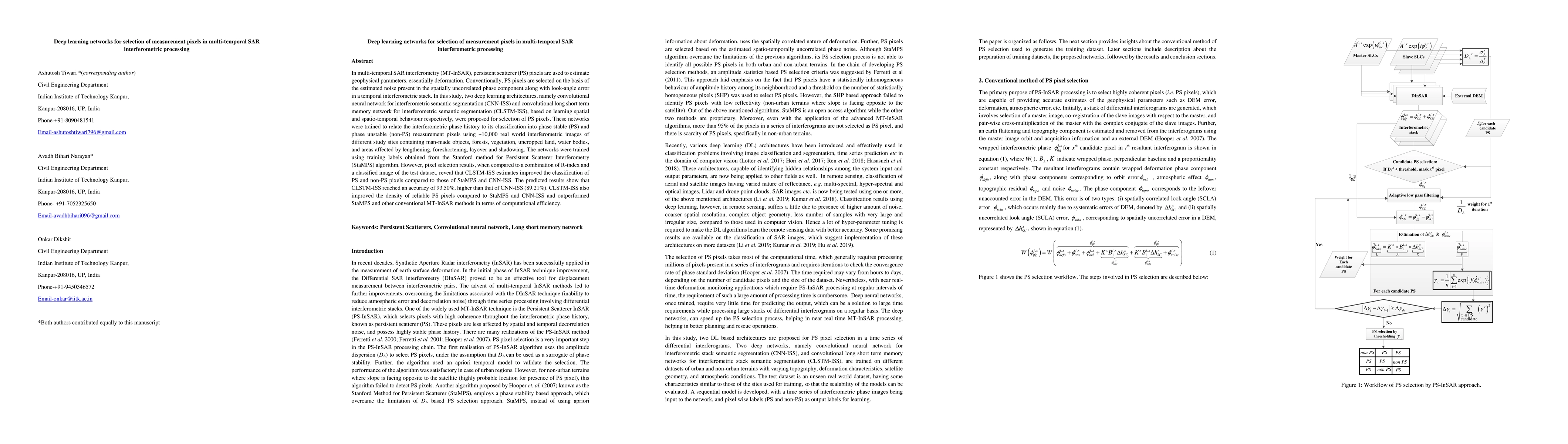 This paper proposes two deep learning networks, CNN-ISS and CLSTM-ISS, for selecting persistent scatterer pixels in multi-temporal SAR interferometry. The CLSTM-ISS network, which incorporates spatio-temporal learning, outperformed conventional methods like StaMPS, achieving 93.50% accuracy and better computational efficiency.