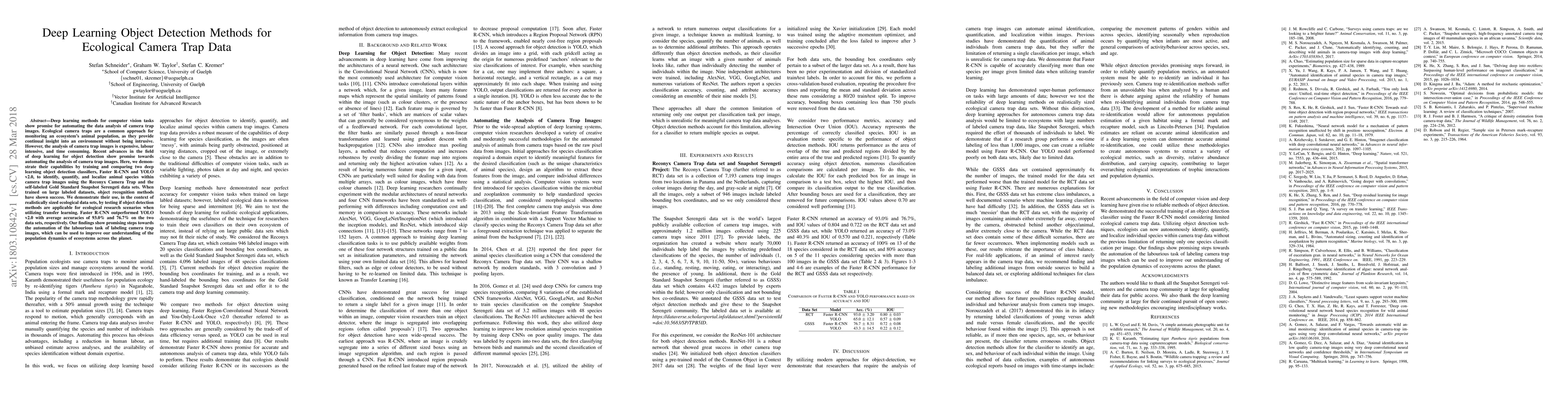 This paper evaluates deep learning methods, specifically Faster R-CNN and YOLO v2.0, for automating the analysis of ecological camera trap images. Faster R-CNN outperformed YOLO v2.0 with accuracies of 93.0% and 76.7%, respectively, demonstrating the potential to reduce labor-intensive image labeling tasks.