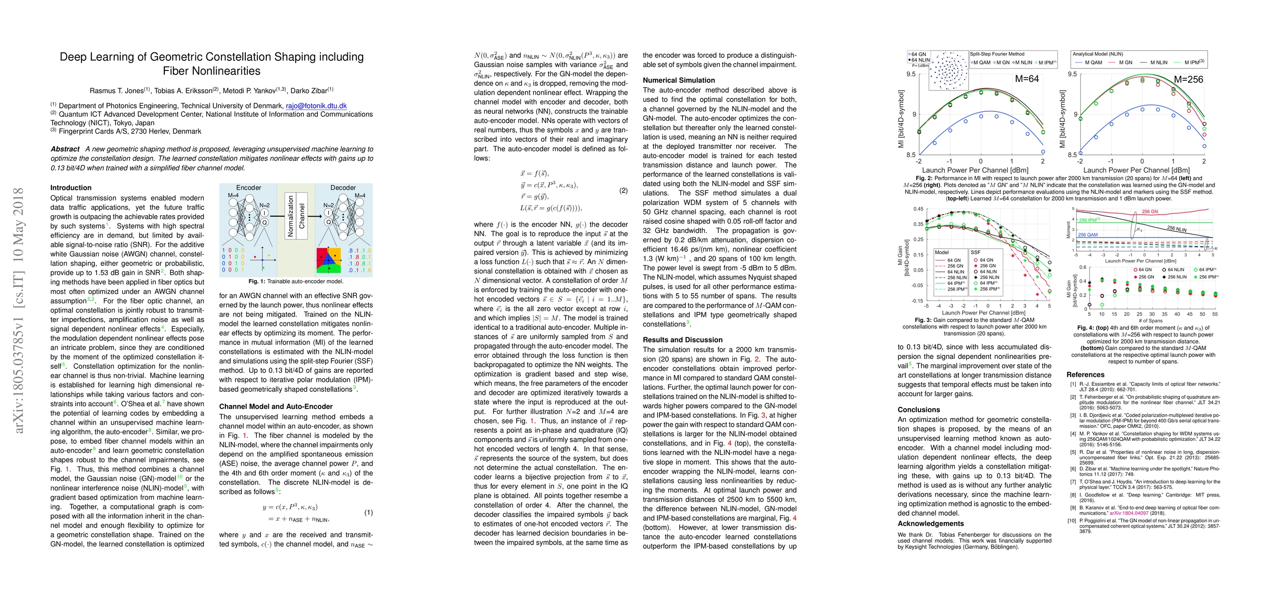 Summary: This paper introduces a novel geometric shaping method using unsupervised machine learning to optimize constellation design, achieving up to 0.13 bit/4D gain by mitigating fiber nonlinearities, as demonstrated through a simplified fiber channel model.