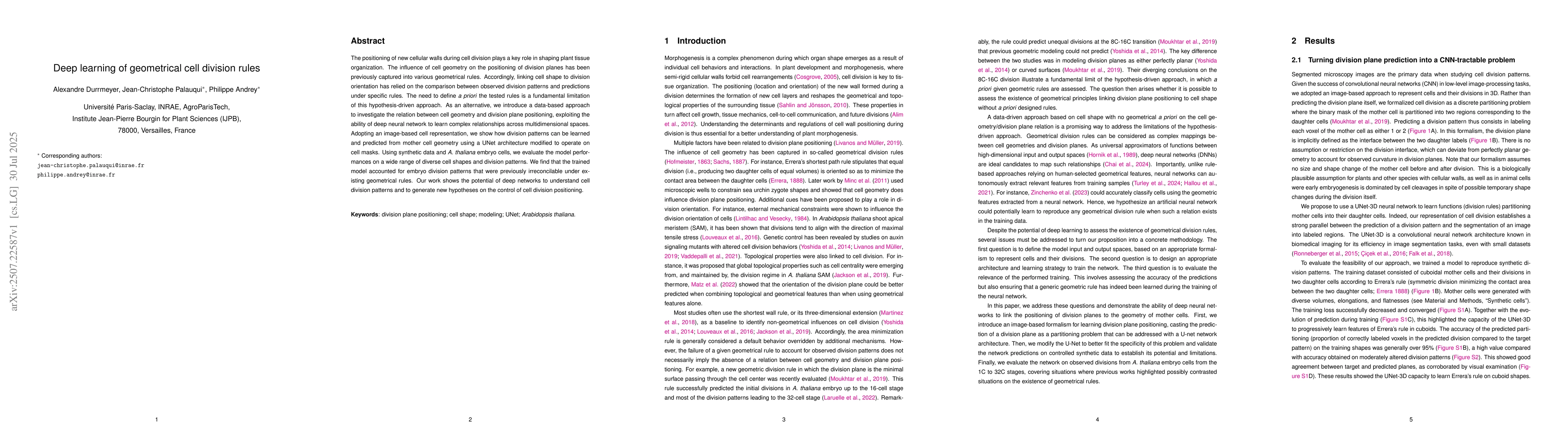This research introduces a data-driven approach using deep neural networks to learn the relationship between cell geometry and division plane positioning in plant cells. The method, employing a modified UNet architecture, successfully predicts division patterns from mother cell shapes, accounting for previously unexplained patterns and suggesting new hypotheses about cell division control.