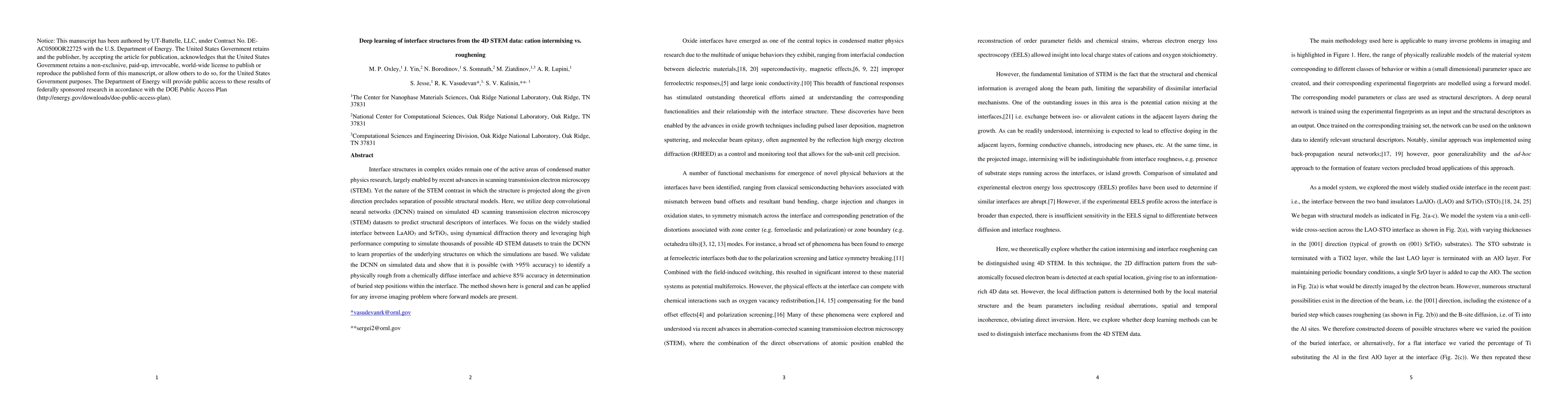 This paper uses deep convolutional neural networks to predict structural descriptors of interfaces in complex oxides from 4D STEM data, achieving high accuracy in distinguishing between physically rough and chemically diffuse interfaces, and determining buried step positions. The method is shown to be generalizable to other inverse imaging problems.