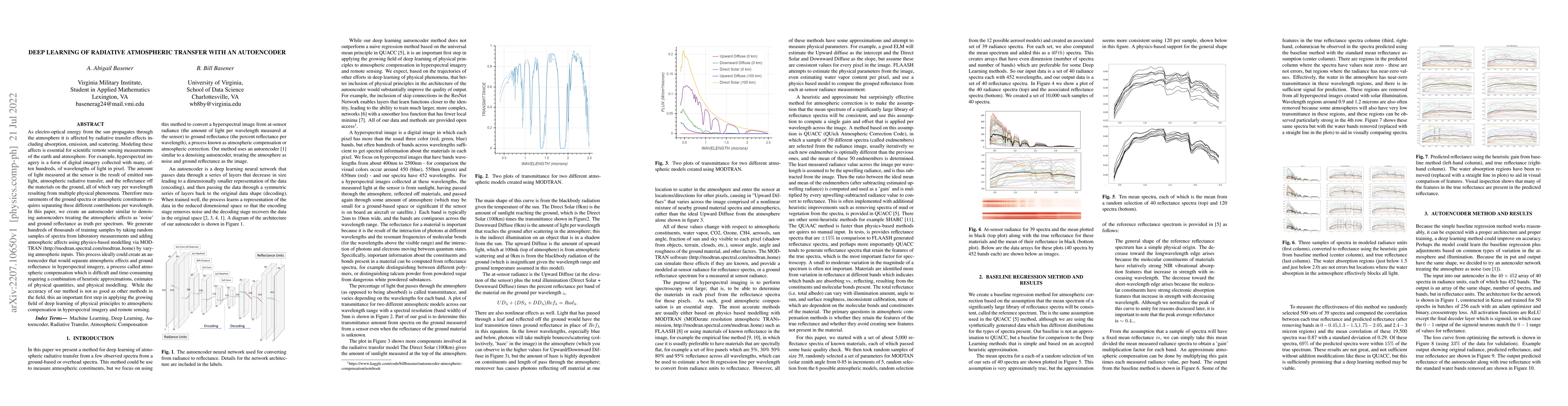 As electro-optical energy from the sun propagates through the atmosphere it is affected by radiative transfer effects including absorption, emission, and scattering. Modeling these affects is essential for scientific remote sensing measurements of the earth and atmosphere. For example, hyperspectral imagery is a form of digital imagery collected with many, often hundreds, of wavelengths of light in pixel. The amount of light measured at the sensor is the result of emitted sunlight, atmospheric radiative transfer, and the reflectance off the materials on the ground, all of which vary per wavelength resulting from multiple physical phenomena. Therefore measurements of the ground spectra or atmospheric constituents requires separating these different contributions per wavelength. In this paper, we create an autoencoder similar to denoising autoencoders treating the atmospheric affects as 'noise' and ground reflectance as truth per spectrum. We generate hundreds of thousands of training samples by taking random samples of spectra from laboratory measurements and adding atmospheric affects using physics-based modelling via MODTRAN (http://modtran.spectral.com/modtran\_home) by varying atmospheric inputs. This process ideally could create an autoencoder that would separate atmospheric effects and ground reflectance in hyperspectral imagery, a process called atmospheric compensation which is difficult and time-consuming requiring a combination of heuristic approximations, estimates of physical quantities, and physical modelling. While the accuracy of our method is not as good as other methods in the field, this an important first step in applying the growing field of deep learning of physical principles to atmospheric compensation in hyperspectral imagery and remote sensing.