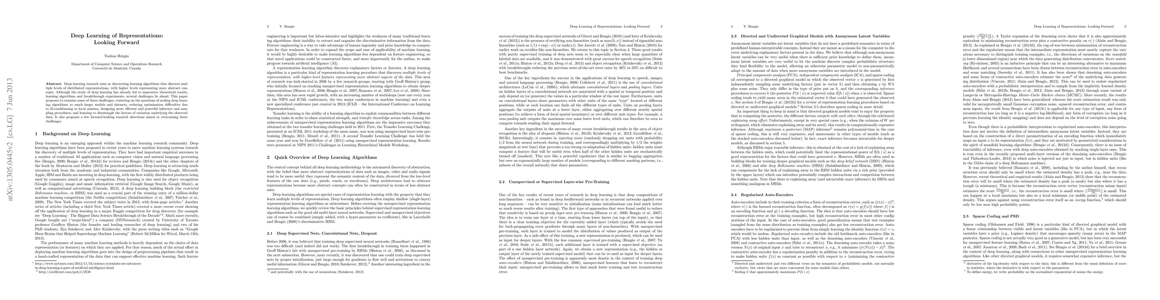 Deep learning research aims at discovering learning algorithms that discover multiple levels of distributed representations, with higher levels representing more abstract concepts. Although the study of deep learning has already led to impressive theoretical results, learning algorithms and breakthrough experiments, several challenges lie ahead. This paper proposes to examine some of these challenges, centering on the questions of scaling deep learning algorithms to much larger models and datasets, reducing optimization difficulties due to ill-conditioning or local minima, designing more efficient and powerful inference and sampling procedures, and learning to disentangle the factors of variation underlying the observed data. It also proposes a few forward-looking research directions aimed at overcoming these challenges.