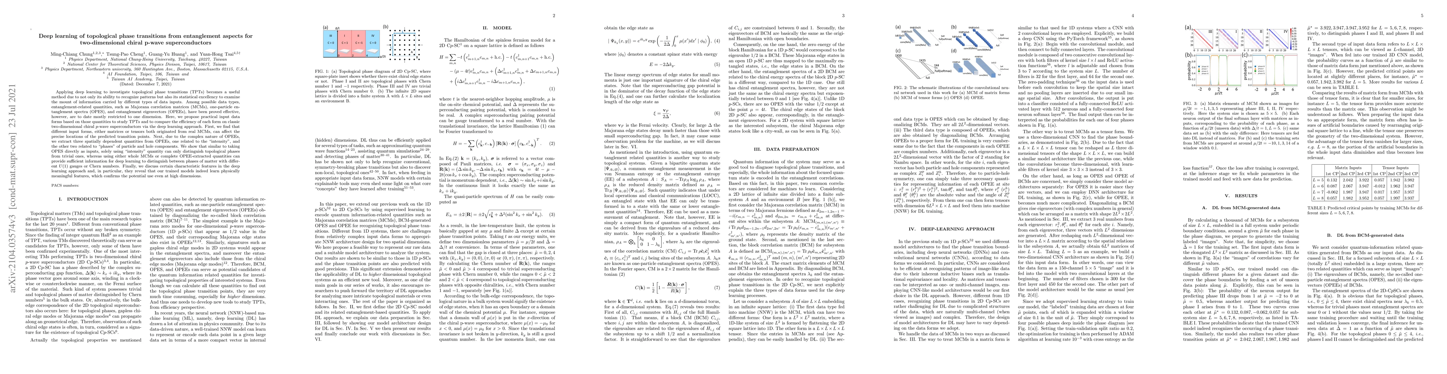 This paper explores the application of deep learning to identify topological phase transitions in two-dimensional chiral p-wave superconductors using entanglement-related quantities. It finds that different input forms, such as matrices or tensors derived from Majorana correlation matrices, affect the accuracy of transition point predictions, and that while "intensity" alone can distinguish topological from trivial phases, complete data sets provide more precise information for distinguishing phases with different $U(1)$ gauges or Chern numbers.