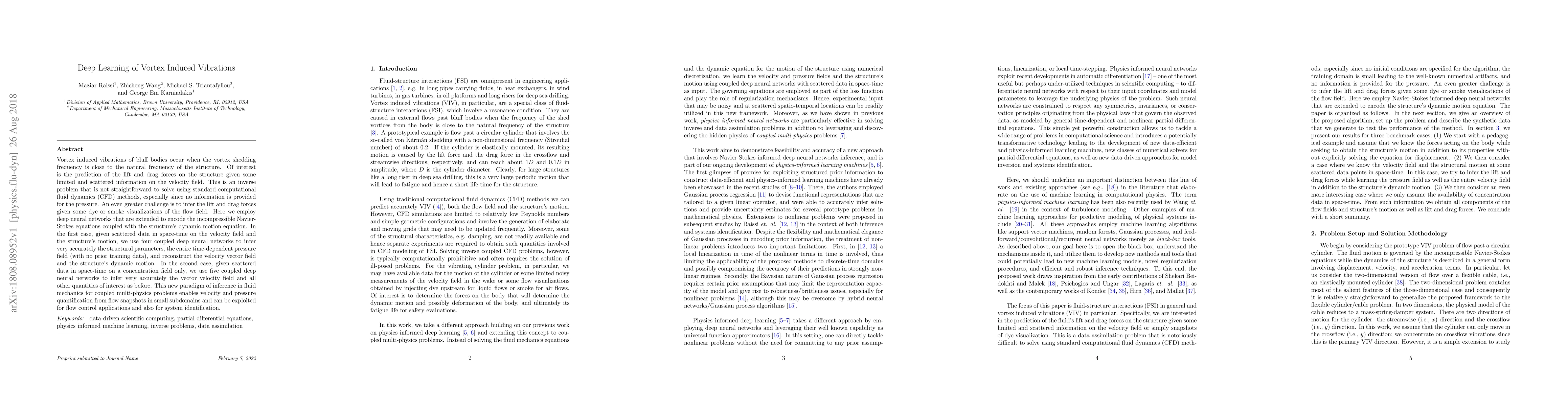 This paper proposes a deep learning approach using coupled neural networks to predict lift and drag forces on bluff bodies experiencing vortex-induced vibrations, leveraging scattered velocity field data and visualizations. The method accurately infers structural parameters, pressure fields, and dynamic motion without prior training data, offering a new paradigm for fluid mechanics and multi-physics problem inference.