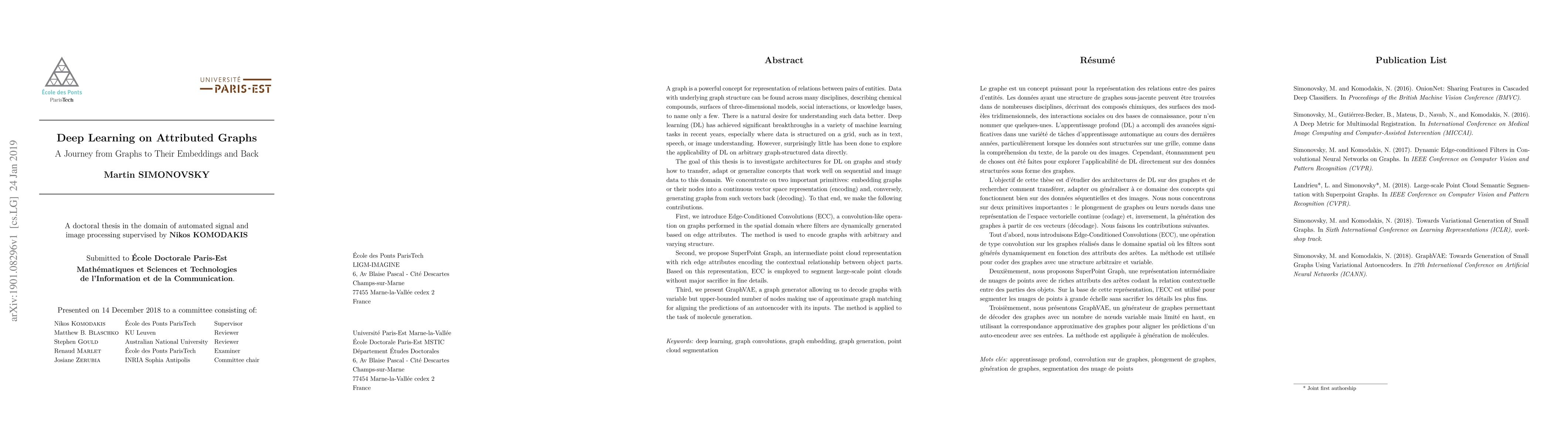 A graph is a powerful concept for representation of relations between pairs of entities. Data with underlying graph structure can be found across many disciplines and there is a natural desire for understanding such data better. Deep learning (DL) has achieved significant breakthroughs in a variety of machine learning tasks in recent years, especially where data is structured on a grid, such as in text, speech, or image understanding. However, surprisingly little has been done to explore the applicability of DL on arbitrary graph-structured data directly. The goal of this thesis is to investigate architectures for DL on graphs and study how to transfer, adapt or generalize concepts that work well on sequential and image data to this domain. We concentrate on two important primitives: embedding graphs or their nodes into a continuous vector space representation (encoding) and, conversely, generating graphs from such vectors back (decoding). To that end, we make the following contributions. First, we introduce Edge-Conditioned Convolutions (ECC), a convolution-like operation on graphs performed in the spatial domain where filters are dynamically generated based on edge attributes. The method is used to encode graphs with arbitrary and varying structure. Second, we propose SuperPoint Graph, an intermediate point cloud representation with rich edge attributes encoding the contextual relationship between object parts. Based on this representation, ECC is employed to segment large-scale point clouds without major sacrifice in fine details. Third, we present GraphVAE, a graph generator allowing us to decode graphs with variable but upper-bounded number of nodes making use of approximate graph matching for aligning the predictions of an autoencoder with its inputs. The method is applied to the task of molecule generation.