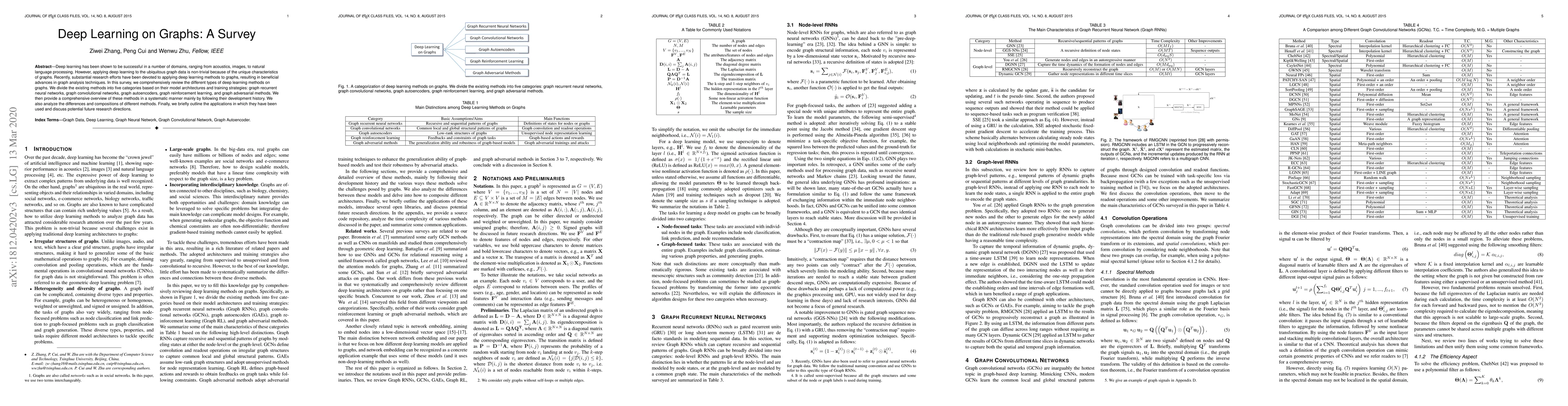 Deep learning has been shown to be successful in a number of domains, ranging from acoustics, images, to natural language processing. However, applying deep learning to the ubiquitous graph data is non-trivial because of the unique characteristics of graphs. Recently, substantial research efforts have been devoted to applying deep learning methods to graphs, resulting in beneficial advances in graph analysis techniques. In this survey, we comprehensively review the different types of deep learning methods on graphs. We divide the existing methods into five categories based on their model architectures and training strategies: graph recurrent neural networks, graph convolutional networks, graph autoencoders, graph reinforcement learning, and graph adversarial methods. We then provide a comprehensive overview of these methods in a systematic manner mainly by following their development history. We also analyze the differences and compositions of different methods. Finally, we briefly outline the applications in which they have been used and discuss potential future research directions.