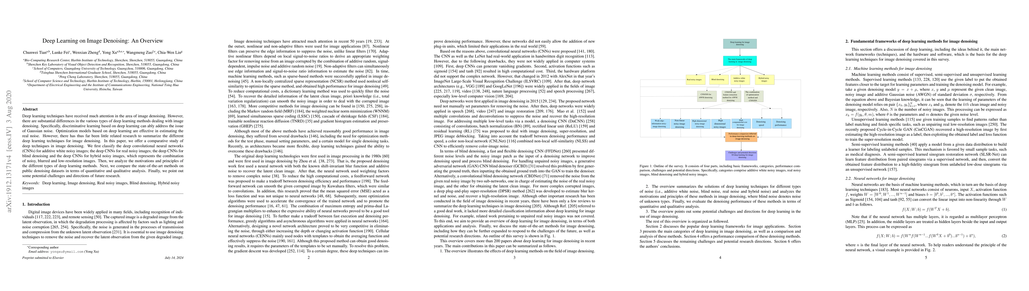 This paper provides a comprehensive overview of deep learning techniques for image denoising, classifying various deep convolutional neural networks and comparing state-of-the-art methods based on quantitative and qualitative analyses, while also discussing future research directions.