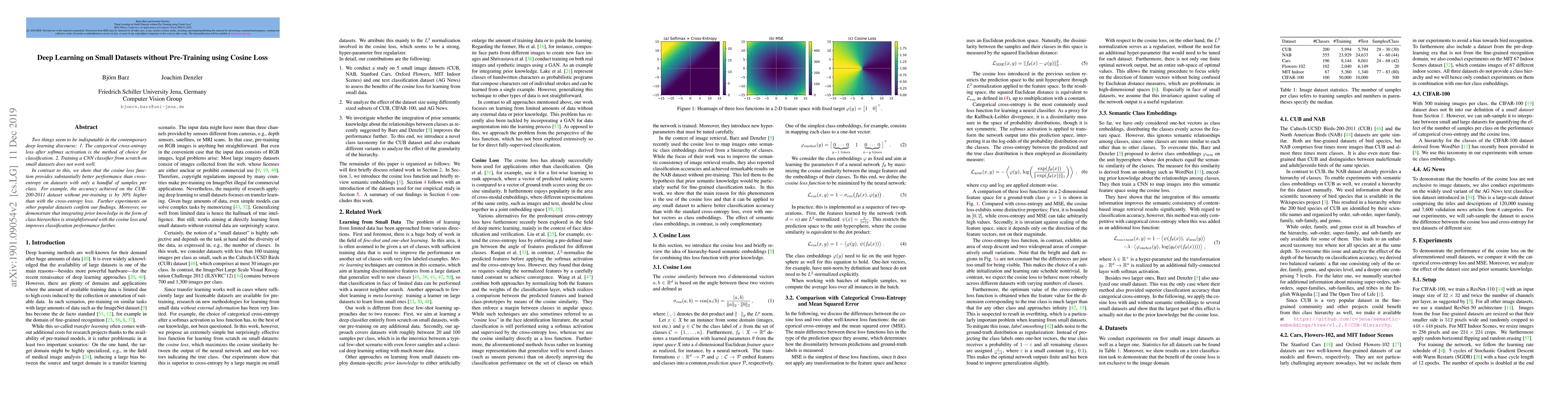 Two things seem to be indisputable in the contemporary deep learning discourse: 1. The categorical cross-entropy loss after softmax activation is the method of choice for classification. 2. Training a CNN classifier from scratch on small datasets does not work well. In contrast to this, we show that the cosine loss function provides significantly better performance than cross-entropy on datasets with only a handful of samples per class. For example, the accuracy achieved on the CUB-200-2011 dataset without pre-training is by 30% higher than with the cross-entropy loss. Further experiments on other popular datasets confirm our findings. Moreover, we demonstrate that integrating prior knowledge in the form of class hierarchies is straightforward with the cosine loss and improves classification performance further.