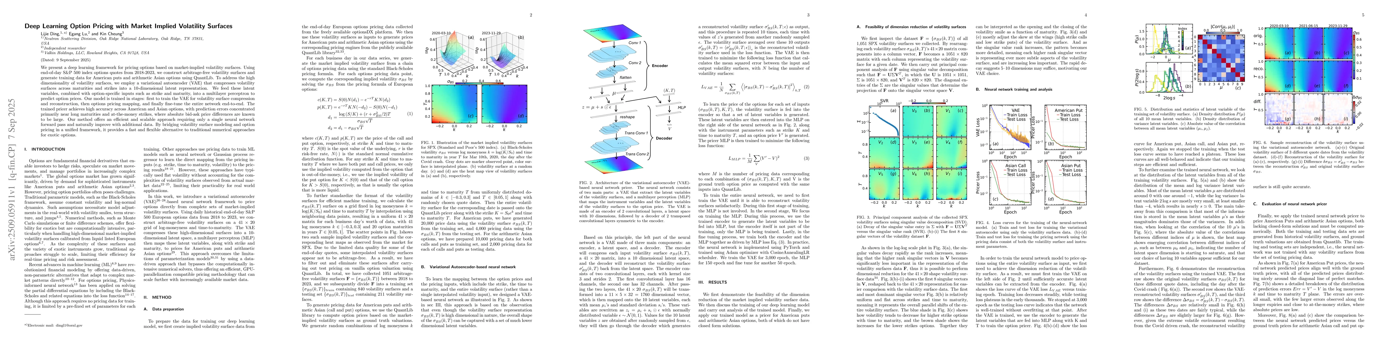 We present a deep learning framework for pricing options based on market-implied volatility surfaces. Using end-of-day S\&P 500 index options quotes from 2018-2023, we construct arbitrage-free volatility surfaces and generate training data for American puts and arithmetic Asian options using QuantLib. To address the high dimensionality of volatility surfaces, we employ a variational autoencoder (VAE) that compresses volatility surfaces across maturities and strikes into a 10-dimensional latent representation. We feed these latent variables, combined with option-specific inputs such as strike and maturity, into a multilayer perceptron to predict option prices. Our model is trained in stages: first to train the VAE for volatility surface compression and reconstruction, then options pricing mapping, and finally fine-tune the entire network end-to-end. The trained pricer achieves high accuracy across American and Asian options, with prediction errors concentrated primarily near long maturities and at-the-money strikes, where absolute bid-ask price differences are known to be large. Our method offers an efficient and scalable approach requiring only a single neural network forward pass and naturally improve with additional data. By bridging volatility surface modeling and option pricing in a unified framework, it provides a fast and flexible alternative to traditional numerical approaches for exotic options.