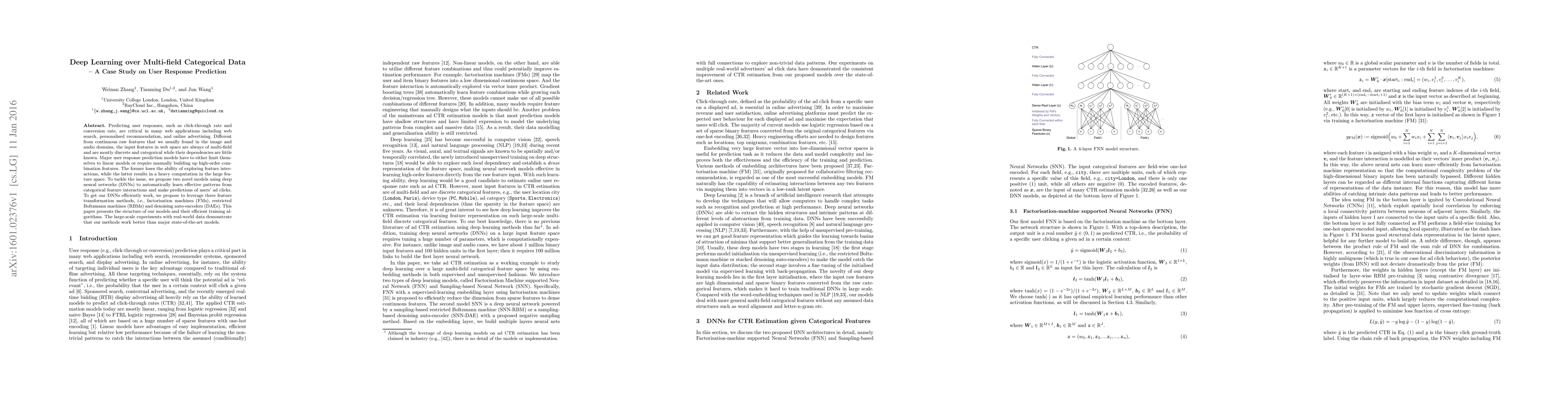 This research introduces deep learning models for predicting user responses like click-through rates, addressing challenges with multi-field categorical data. It proposes novel DNN structures using feature transformation methods like factorisation machines, restricted Boltzmann machines, and denoising auto-encoders, which outperform traditional models in large-scale experiments with real-world data.