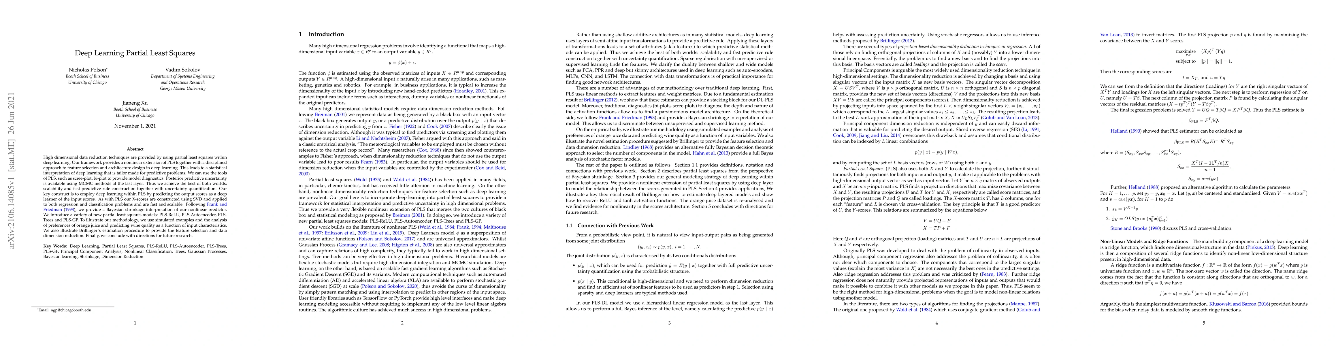 High dimensional data reduction techniques are provided by using partial least squares within deep learning. Our framework provides a nonlinear extension of PLS together with a disciplined approach to feature selection and architecture design in deep learning. This leads to a statistical interpretation of deep learning that is tailor made for predictive problems. We can use the tools of PLS, such as scree-plot, bi-plot to provide model diagnostics. Posterior predictive uncertainty is available using MCMC methods at the last layer. Thus we achieve the best of both worlds: scalability and fast predictive rule construction together with uncertainty quantification. Our key construct is to employ deep learning within PLS by predicting the output scores as a deep learner of the input scores. As with PLS our X-scores are constructed using SVD and applied to both regression and classification problems and are fast and scalable. Following Frank and Friedman 1993, we provide a Bayesian shrinkage interpretation of our nonlinear predictor. We introduce a variety of new partial least squares models: PLS-ReLU, PLS-Autoencoder, PLS-Trees and PLS-GP. To illustrate our methodology, we use simulated examples and the analysis of preferences of orange juice and predicting wine quality as a function of input characteristics. We also illustrate Brillinger's estimation procedure to provide the feature selection and data dimension reduction. Finally, we conclude with directions for future research.