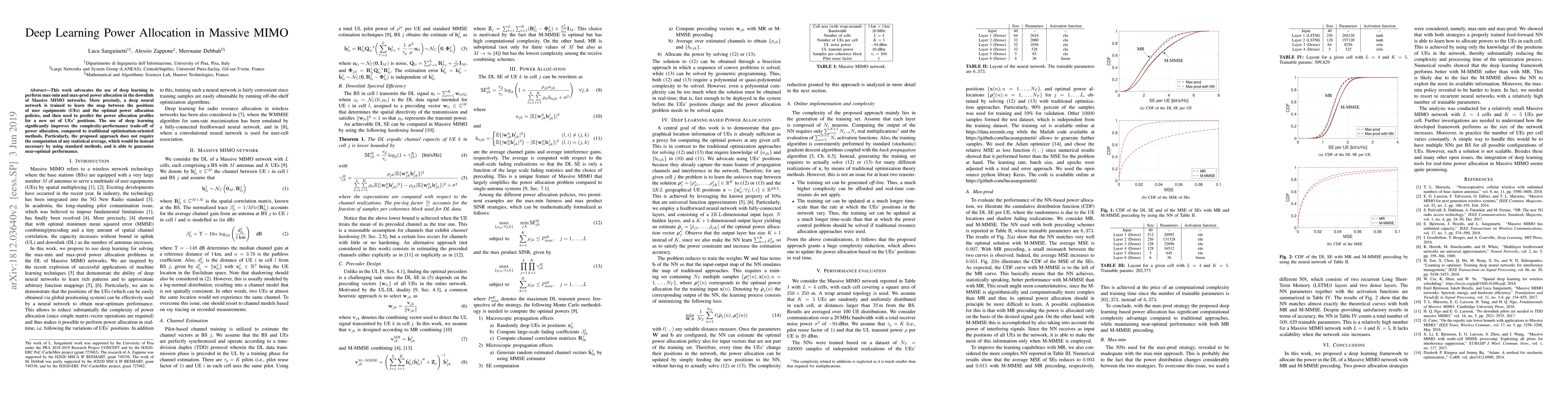 This paper proposes using deep learning for max-min and max-prod power allocation in Massive MIMO networks, training a neural network to predict optimal power allocation based on user positions, thereby improving the complexity-performance trade-off and achieving near-optimal performance without statistical averages.