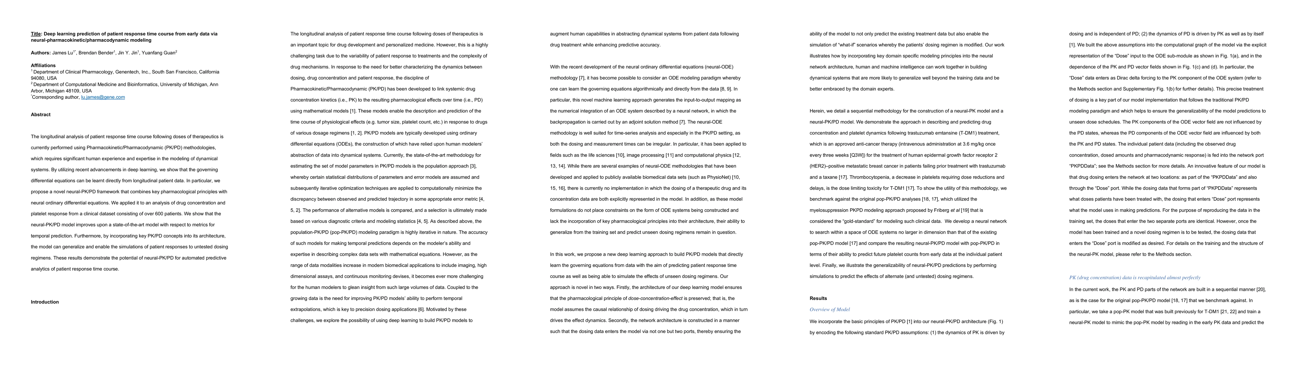 This paper proposes a novel neural-PK/PD framework that uses deep learning to predict patient response time courses from early data, improving upon traditional PK/PD models by learning governing differential equations directly from longitudinal data. The model demonstrates enhanced temporal prediction and generalization capabilities for untested dosing regimens.