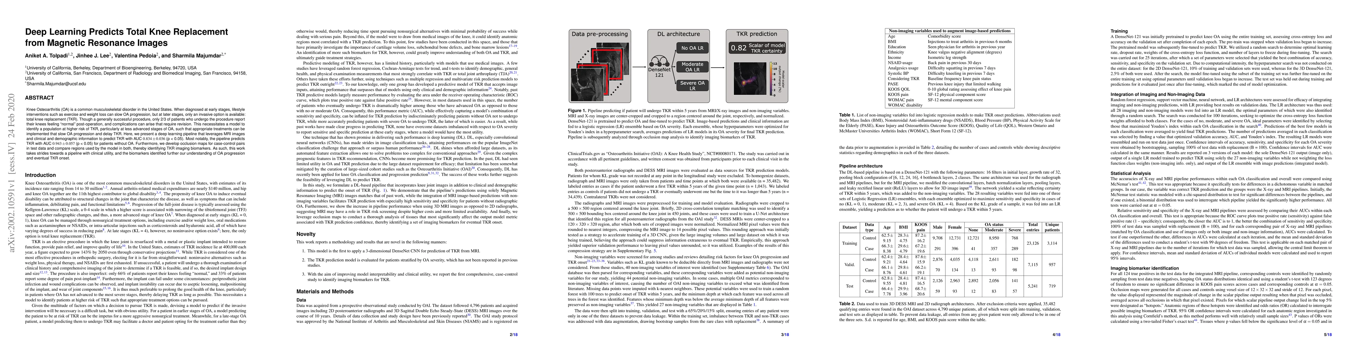 Knee Osteoarthritis (OA) is a common musculoskeletal disorder in the United States. When diagnosed at early stages, lifestyle interventions such as exercise and weight loss can slow OA progression, but at later stages, only an invasive option is available: total knee replacement (TKR). Though a generally successful procedure, only 2/3 of patients who undergo the procedure report their knees feeling ''normal'' post-operation, and complications can arise that require revision. This necessitates a model to identify a population at higher risk of TKR, particularly at less advanced stages of OA, such that appropriate treatments can be implemented that slow OA progression and delay TKR. Here, we present a deep learning pipeline that leverages MRI images and clinical and demographic information to predict TKR with AUC $0.834 \pm 0.036$ (p < 0.05). Most notably, the pipeline predicts TKR with AUC $0.943 \pm 0.057$ (p < 0.05) for patients without OA. Furthermore, we develop occlusion maps for case-control pairs in test data and compare regions used by the model in both, thereby identifying TKR imaging biomarkers. As such, this work takes strides towards a pipeline with clinical utility, and the biomarkers identified further our understanding of OA progression and eventual TKR onset.