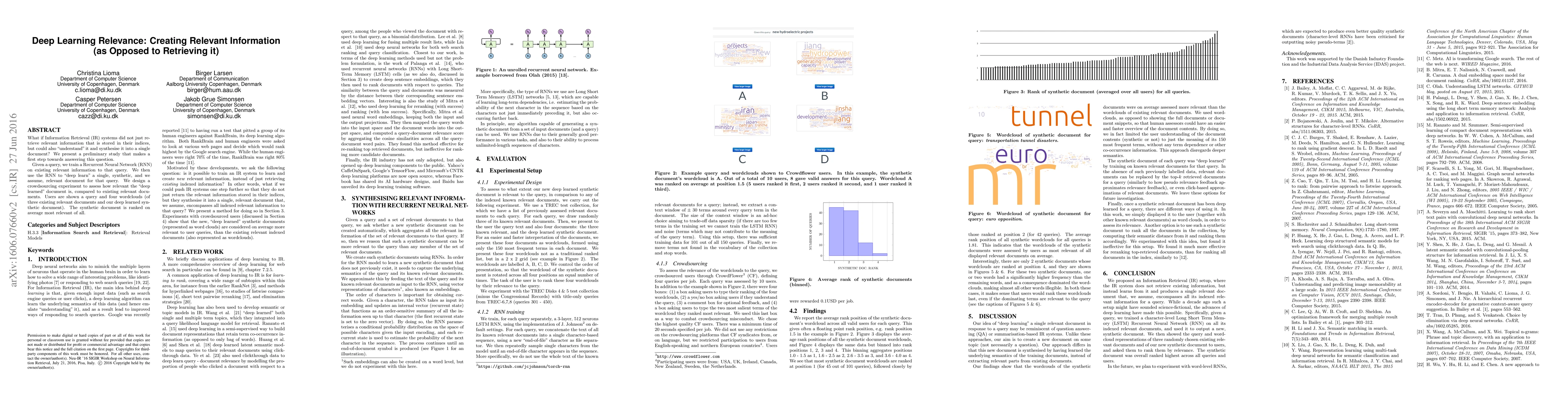 What if Information Retrieval (IR) systems did not just retrieve relevant information that is stored in their indices, but could also "understand" it and synthesise it into a single document? We present a preliminary study that makes a first step towards answering this question. Given a query, we train a Recurrent Neural Network (RNN) on existing relevant information to that query. We then use the RNN to "deep learn" a single, synthetic, and we assume, relevant document for that query. We design a crowdsourcing experiment to assess how relevant the "deep learned" document is, compared to existing relevant documents. Users are shown a query and four wordclouds (of three existing relevant documents and our deep learned synthetic document). The synthetic document is ranked on average most relevant of all.
