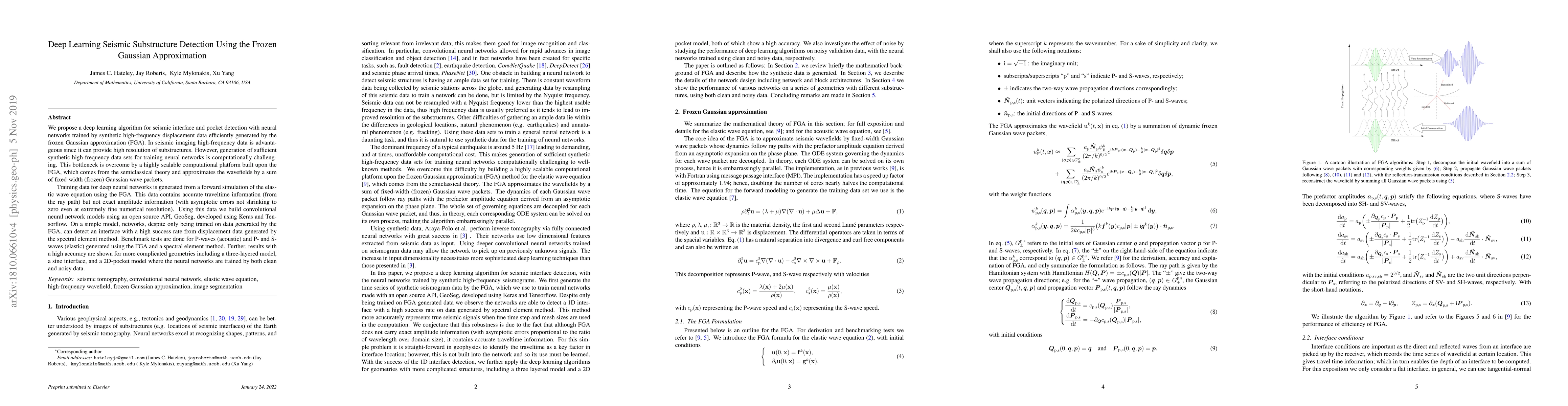 We propose a deep learning algorithm for seismic interface and pocket detection with neural networks trained by synthetic high-frequency displacement data efficiently generated by the frozen Gaussian approximation (FGA). In seismic imaging high-frequency data is advantageous since it can provide high resolution of substructures. However, generation of sufficient synthetic high-frequency data sets for training neural networks is computationally challenging. This bottleneck is overcome by a highly scalable computational platform built upon the FGA, which comes from the semiclassical theory and approximates the wavefields by a sum of fixed-width (frozen) Gaussian wave packets. Data is generated from a forward simulation of the elastic wave equation using the FGA. This data contains accurate traveltime information (from the ray path) but not exact amplitude information (with asymptotic errors not shrinking to zero even at extremely fine numerical resolution). Using this data we build convolutional neural network models using an open source API, GeoSeg, developed using Keras and Tensorflow. On a simple model, networks, despite only being trained on FGA data, can detect an interface with a high success rate from displacement data generated by the spectral element method. Benchmark tests are done for P-waves (acoustic) and P- and S-waves (elastic) generated using the FGA and a spectral element method. Further, results with a high accuracy are shown for more complicated geometries including a three layered model, and a 2D-pocket model where the neural networks trained by both clean and noisy data.