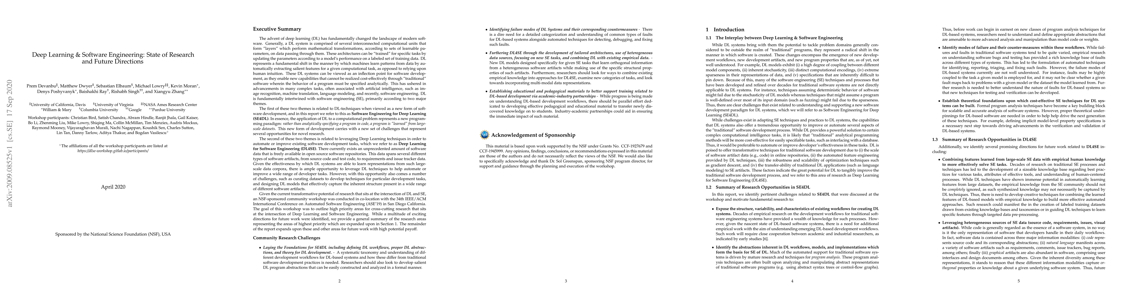 This paper summarizes high-priority research areas at the intersection of Deep Learning and Software Engineering identified at a NSF-sponsored workshop. It aims to guide future research efforts by highlighting promising directions and potential collaborations between these fields.