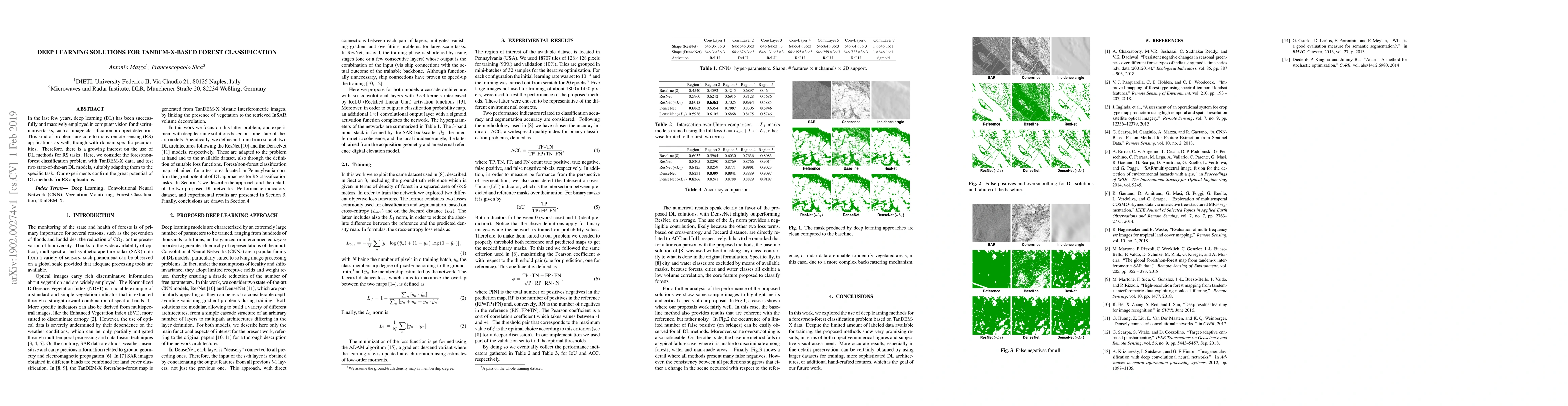 In the last few years, deep learning (DL) has been successfully and massively employed in computer vision for discriminative tasks, such as image classification or object detection. This kind of problems are core to many remote sensing (RS) applications as well, though with domain-specific peculiarities. Therefore, there is a growing interest on the use of DL methods for RS tasks. Here, we consider the forest/non-forest classification problem with TanDEM-X data, and test two state-of-the-art DL models, suitably adapting them to the specific task. Our experiments confirm the great potential of DL methods for RS applications.