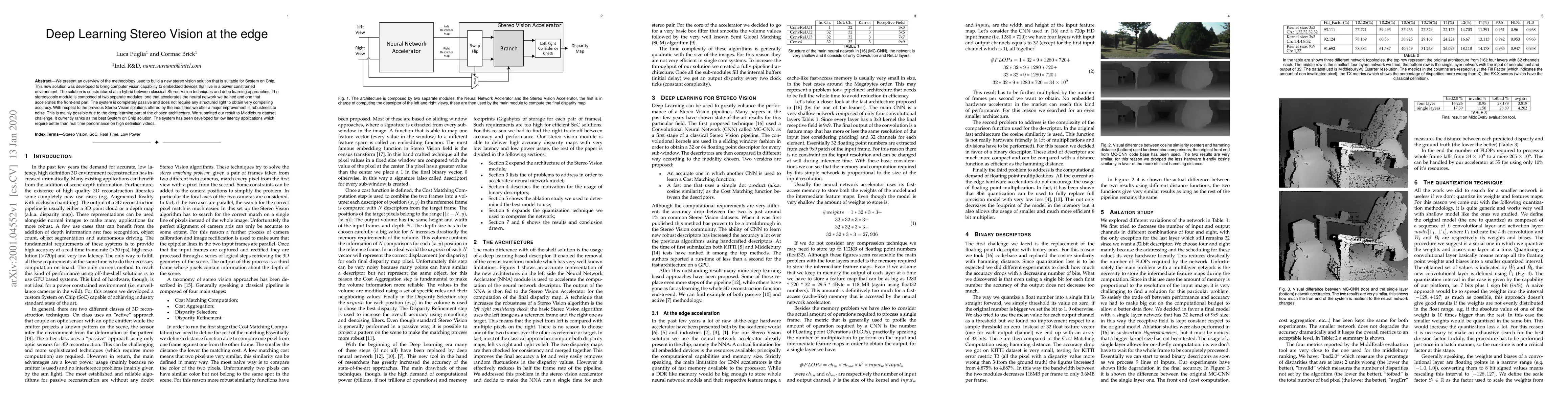 This paper introduces a hybrid deep learning and classical stereo vision system for edge computing, designed for power-constrained embedded devices. The system achieves high accuracy and robustness to noise, outperforming previous solutions, and ranks as the best System on Chip solution in the Middlebury dataset challenge.