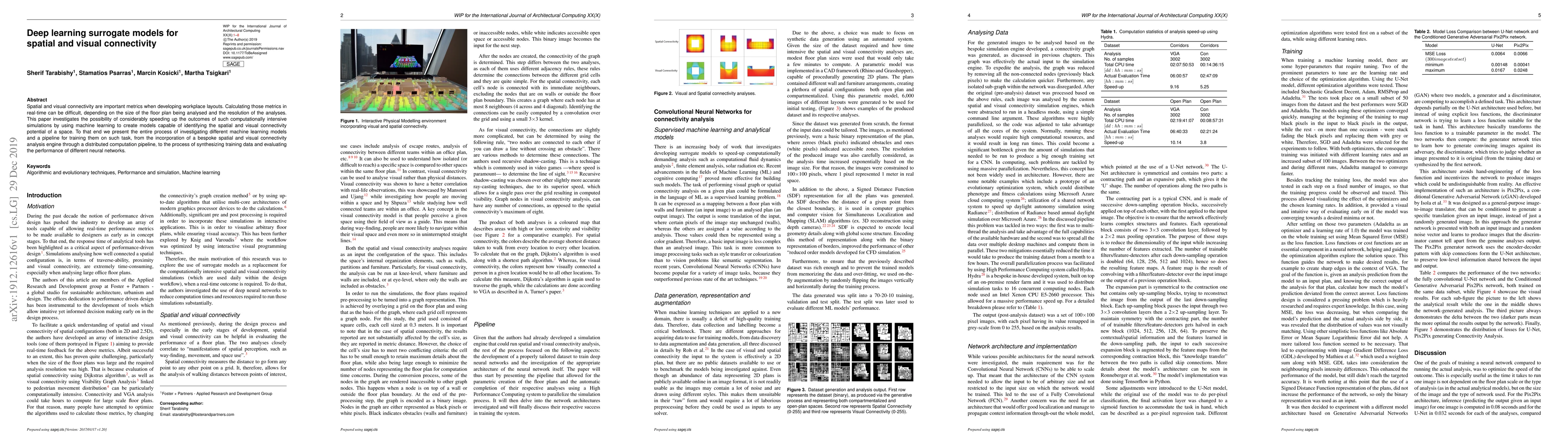 Spatial and visual connectivity are important metrics when developing workplace layouts. Calculating those metrics in real-time can be difficult, depending on the size of the floor plan being analysed and the resolution of the analyses. This paper investigates the possibility of considerably speeding up the outcomes of such computationally intensive simulations by using machine learning to create models capable of identifying the spatial and visual connectivity potential of a space. To that end we present the entire process of investigating different machine learning models and a pipeline for training them on such task, from the incorporation of a bespoke spatial and visual connectivity analysis engine through a distributed computation pipeline, to the process of synthesizing training data and evaluating the performance of different neural networks.
