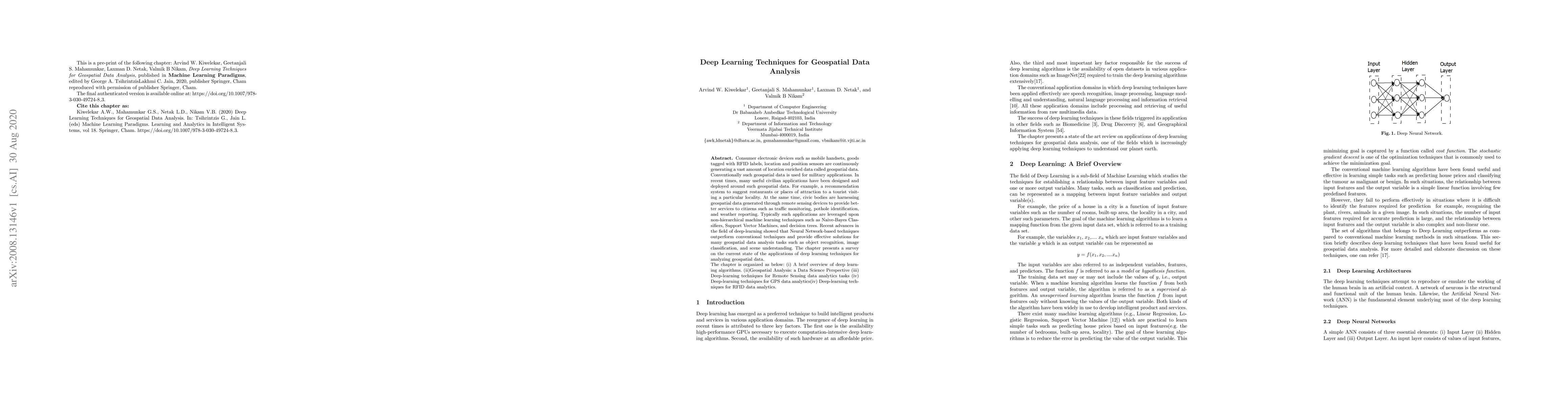 Consumer electronic devices such as mobile handsets, goods tagged with RFID labels, location and position sensors are continuously generating a vast amount of location enriched data called geospatial data. Conventionally such geospatial data is used for military applications. In recent times, many useful civilian applications have been designed and deployed around such geospatial data. For example, a recommendation system to suggest restaurants or places of attraction to a tourist visiting a particular locality. At the same time, civic bodies are harnessing geospatial data generated through remote sensing devices to provide better services to citizens such as traffic monitoring, pothole identification, and weather reporting. Typically such applications are leveraged upon non-hierarchical machine learning techniques such as Naive-Bayes Classifiers, Support Vector Machines, and decision trees. Recent advances in the field of deep-learning showed that Neural Network-based techniques outperform conventional techniques and provide effective solutions for many geospatial data analysis tasks such as object recognition, image classification, and scene understanding. The chapter presents a survey on the current state of the applications of deep learning techniques for analyzing geospatial data. The chapter is organized as below: (i) A brief overview of deep learning algorithms. (ii)Geospatial Analysis: a Data Science Perspective (iii) Deep-learning techniques for Remote Sensing data analytics tasks (iv) Deep-learning techniques for GPS data analytics(iv) Deep-learning techniques for RFID data analytics.