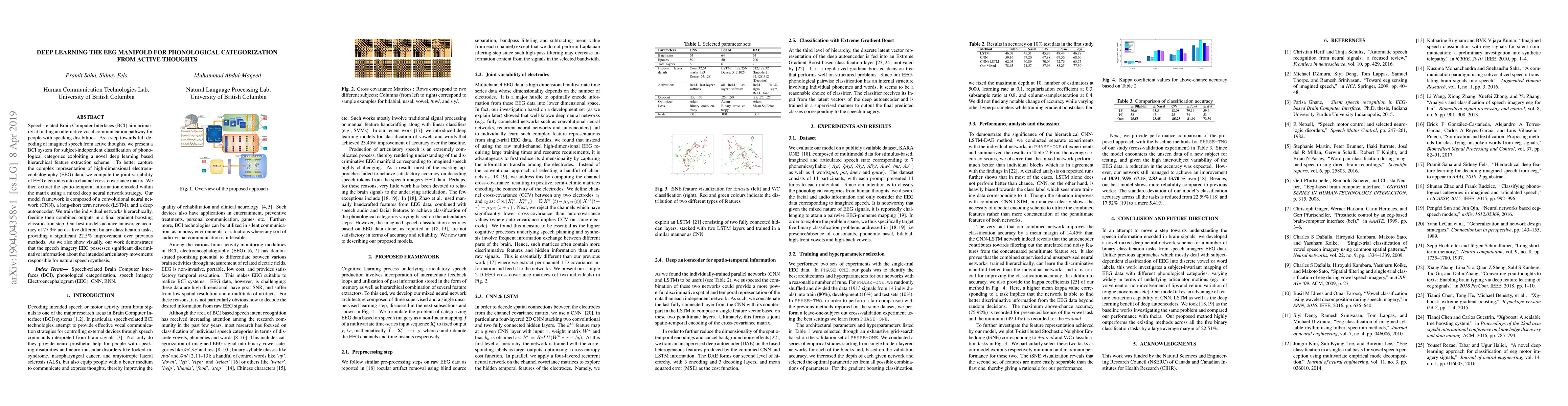This research introduces a deep learning-based Brain Computer Interface (BCI) system for classifying phonological categories from EEG data during active thought processes, achieving an average accuracy of 77.9%. The methodology involves a hierarchical feature extraction scheme using CNN, LSTM, and a deep autoencoder, significantly improving upon previous methods by 22.5%. The findings suggest that EEG data holds valuable information regarding intended speech articulatory movements.