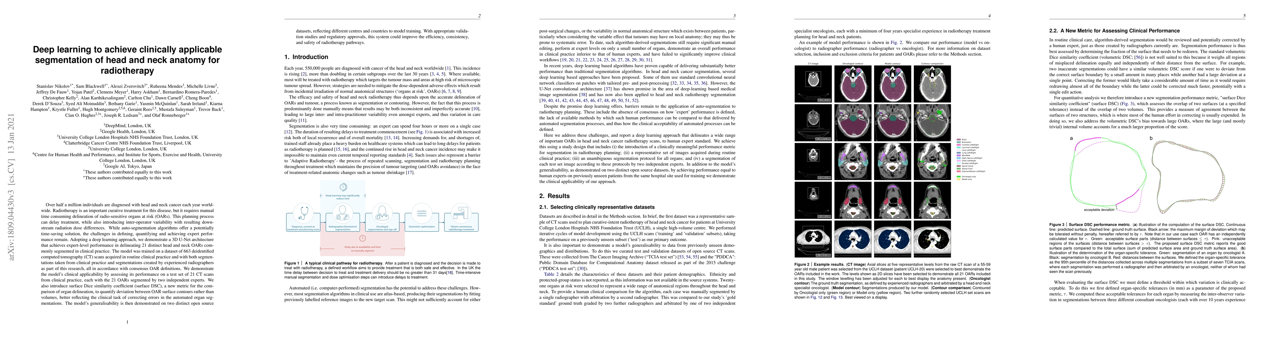This research presents a deep learning-based 3D U-Net model achieving expert-level segmentation of 21 head and neck organs at risk (OARs) for radiotherapy, trained on 663 CT scans and validated on 21 additional scans. The study introduces a new surface Dice similarity coefficient metric for more accurate organ delineation comparisons.