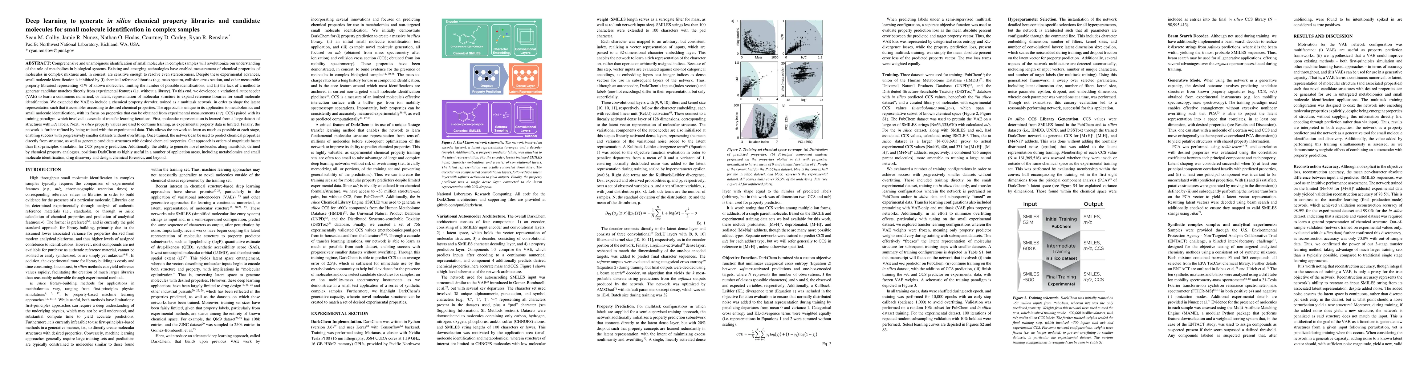 This paper introduces a variational autoencoder (VAE) to generate in silico chemical property libraries and candidate molecules for small molecule identification in complex samples. The VAE learns a latent representation of molecular structures and predicts chemical properties, enabling the generation of novel molecules with desired properties, thus addressing the limitations of existing chemical reference libraries.