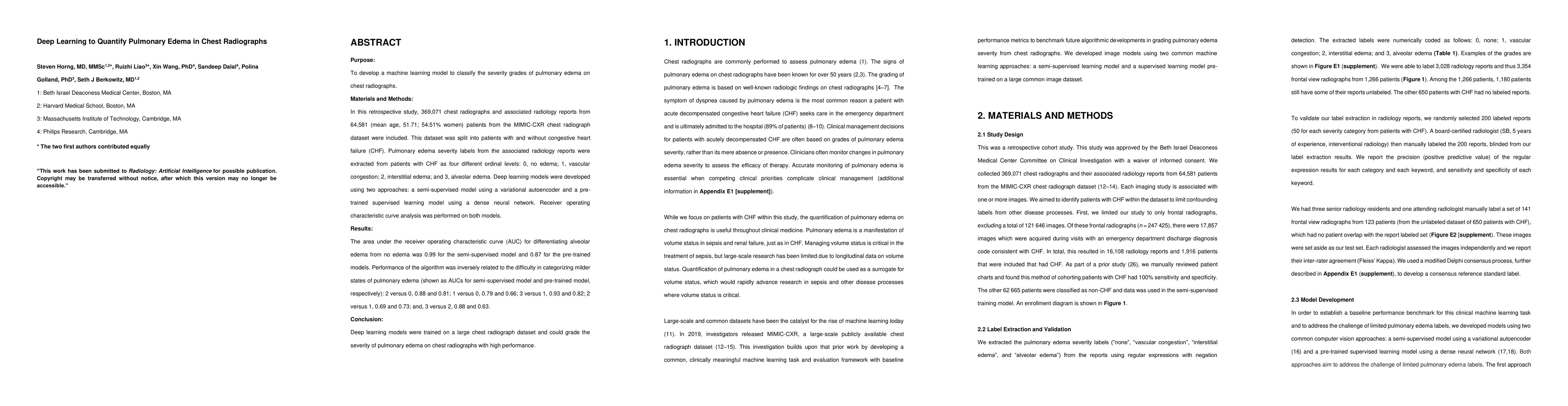 Purpose: To develop a machine learning model to classify the severity grades of pulmonary edema on chest radiographs. Materials and Methods: In this retrospective study, 369,071 chest radiographs and associated radiology reports from 64,581 (mean age, 51.71; 54.51% women) patients from the MIMIC-CXR chest radiograph dataset were included. This dataset was split into patients with and without congestive heart failure (CHF). Pulmonary edema severity labels from the associated radiology reports were extracted from patients with CHF as four different ordinal levels: 0, no edema; 1, vascular congestion; 2, interstitial edema; and 3, alveolar edema. Deep learning models were developed using two approaches: a semi-supervised model using a variational autoencoder and a pre-trained supervised learning model using a dense neural network. Receiver operating characteristic curve analysis was performed on both models. Results: The area under the receiver operating characteristic curve (AUC) for differentiating alveolar edema from no edema was 0.99 for the semi-supervised model and 0.87 for the pre-trained models. Performance of the algorithm was inversely related to the difficulty in categorizing milder states of pulmonary edema (shown as AUCs for semi-supervised model and pre-trained model, respectively): 2 versus 0, 0.88 and 0.81; 1 versus 0, 0.79 and 0.66; 3 versus 1, 0.93 and 0.82; 2 versus 1, 0.69 and 0.73; and, 3 versus 2, 0.88 and 0.63. Conclusion: Deep learning models were trained on a large chest radiograph dataset and could grade the severity of pulmonary edema on chest radiographs with high performance.