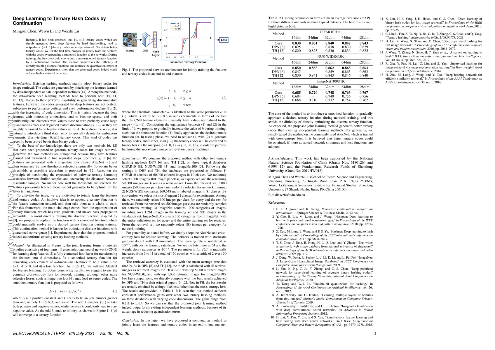 This paper proposes a method to jointly learn deep features and ternary hash codes using a smoothed function, which evolves into a non-smoothed ternary function via continuation during training. This approach reduces quantization errors and improves image retrieval accuracy compared to binary codes.