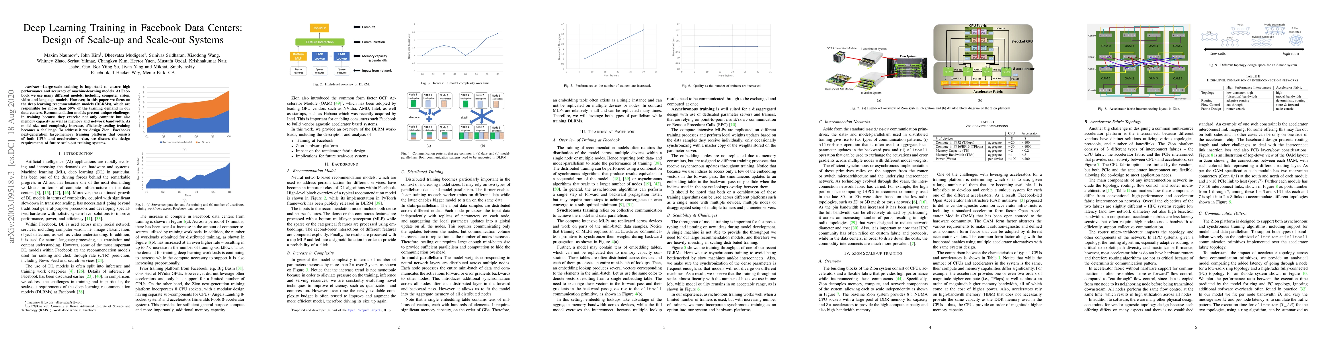 This paper discusses Facebook's Zion platform, designed to efficiently scale up and out for training large deep learning recommendation models (DLRMs) that dominate their data center training demands. Zion integrates CPUs and accelerators to optimize memory and network bandwidth, addressing the challenges of scaling with increasing model size and complexity.