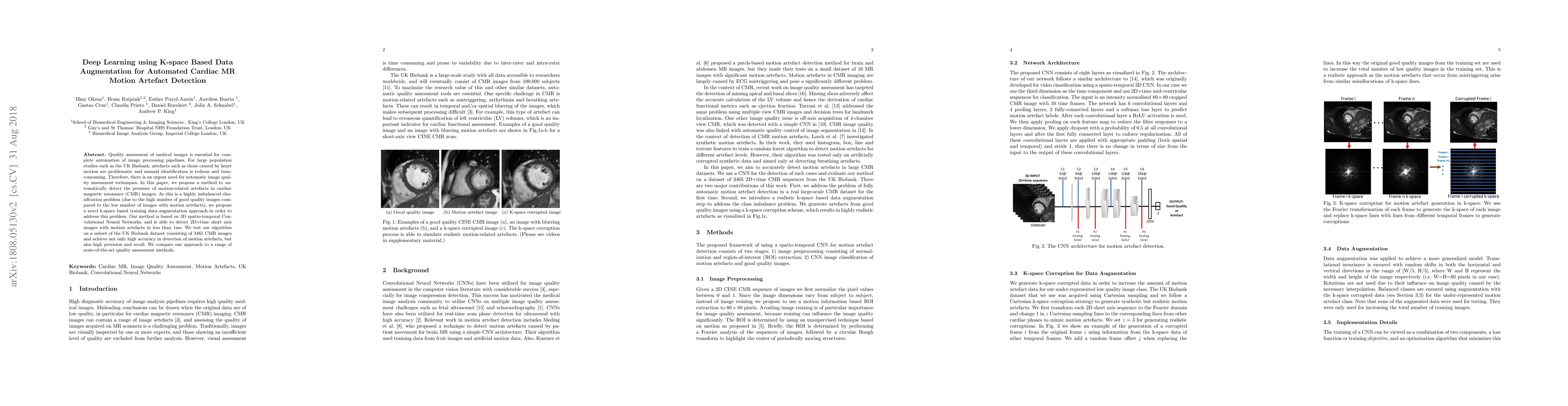 This paper proposes a deep learning method using k-space-based data augmentation to automatically detect motion artefacts in cardiac MRI images, addressing the imbalanced classification issue. The method employs 3D spatio-temporal CNNs and achieves high accuracy, precision, and recall on a UK Biobank dataset, outperforming state-of-the-art quality assessment methods.