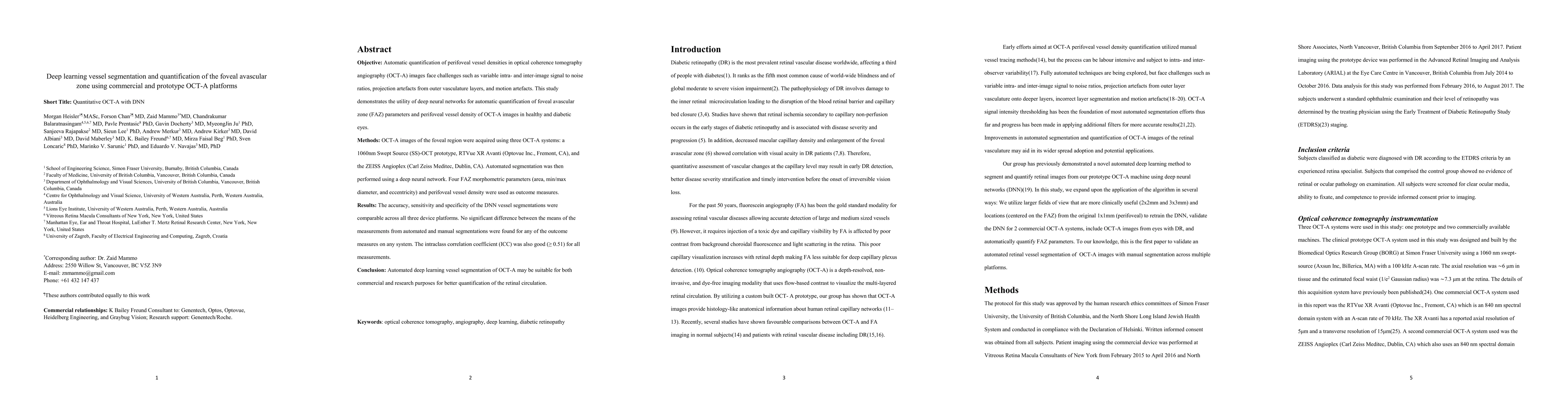 This study uses deep neural networks to automatically quantify foveal avascular zone parameters and perifoveal vessel density in OCT-A images from three different devices. The deep learning method shows comparable accuracy and good intraclass correlation with manual segmentations, indicating its potential for both commercial and research applications in retinal circulation analysis.
