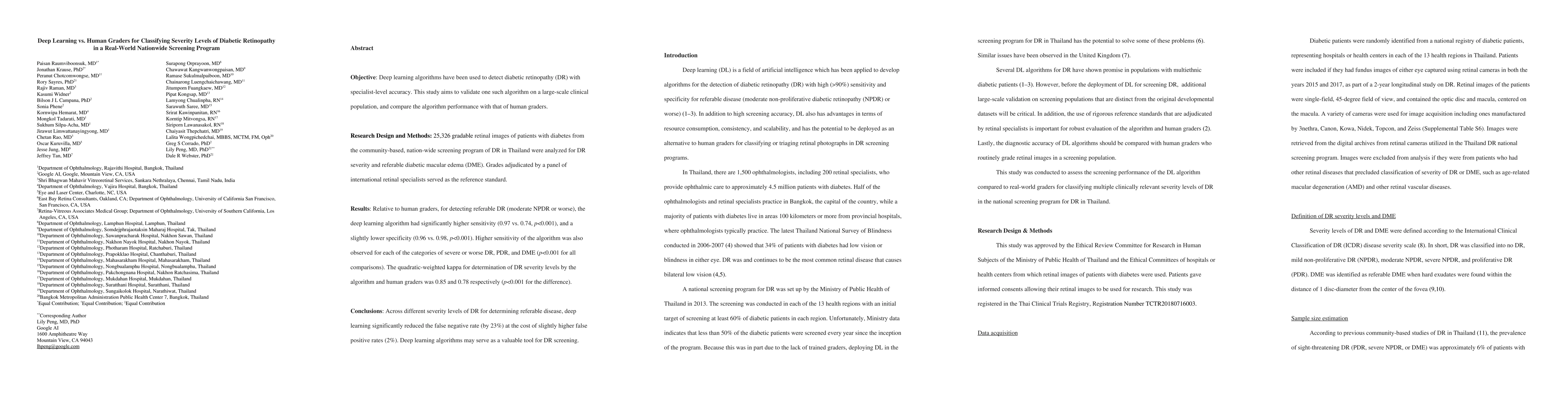 This study compares deep learning algorithms to human graders in classifying diabetic retinopathy severity in a large-scale Thai screening program, finding that deep learning reduces false negatives by 23% but slightly increases false positives by 2%. The results suggest deep learning could be a valuable screening tool.