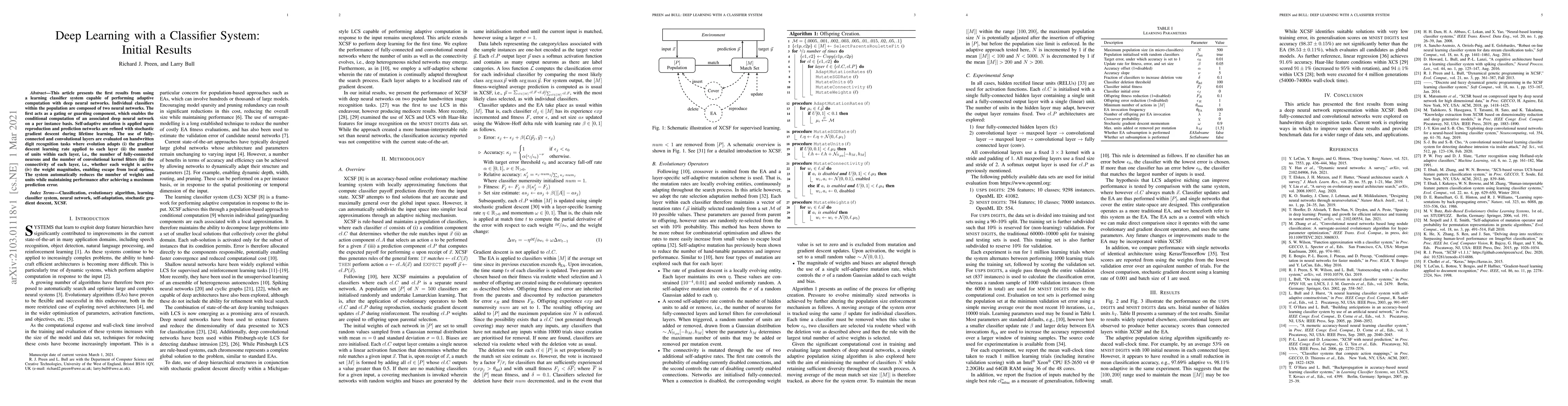 This article presents the first results from using a learning classifier system capable of performing adaptive computation with deep neural networks. Individual classifiers within the population are composed of two neural networks. The first acts as a gating or guarding component, which enables the conditional computation of an associated deep neural network on a per instance basis. Self-adaptive mutation is applied upon reproduction and prediction networks are refined with stochastic gradient descent during lifetime learning. The use of fully-connected and convolutional layers are evaluated on handwritten digit recognition tasks where evolution adapts (i) the gradient descent learning rate applied to each layer (ii) the number of units within each layer, i.e., the number of fully-connected neurons and the number of convolutional kernel filters (iii) the connectivity of each layer, i.e., whether each weight is active (iv) the weight magnitudes, enabling escape from local optima. The system automatically reduces the number of weights and units while maintaining performance after achieving a maximum prediction error.