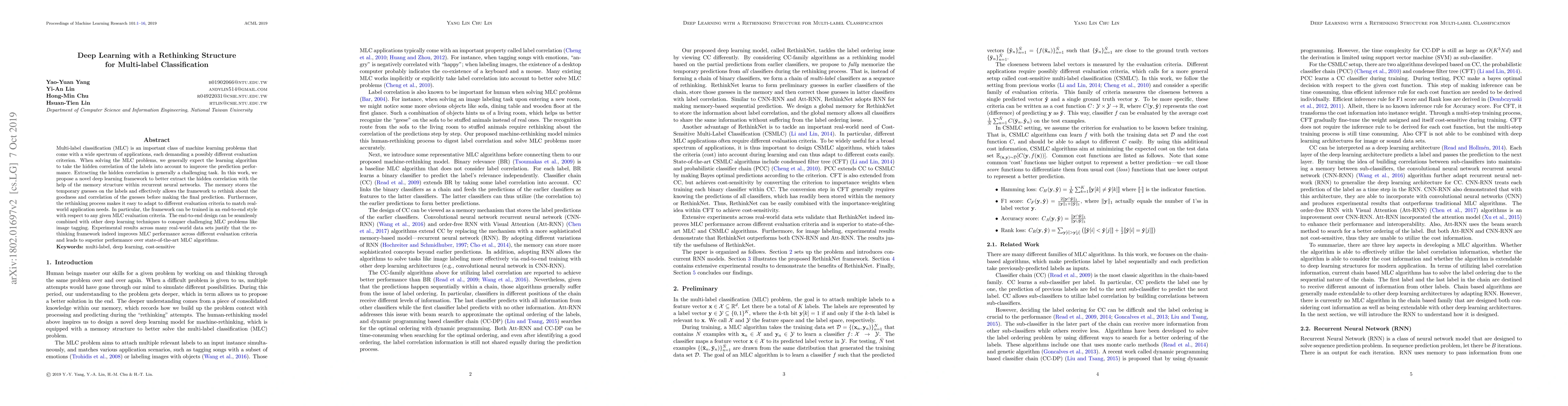 Multi-label classification (MLC) is an important class of machine learning problems that come with a wide spectrum of applications, each demanding a possibly different evaluation criterion. When solving the MLC problems, we generally expect the learning algorithm to take the hidden correlation of the labels into account to improve the prediction performance. Extracting the hidden correlation is generally a challenging task. In this work, we propose a novel deep learning framework to better extract the hidden correlation with the help of the memory structure within recurrent neural networks. The memory stores the temporary guesses on the labels and effectively allows the framework to rethink about the goodness and correlation of the guesses before making the final prediction. Furthermore, the rethinking process makes it easy to adapt to different evaluation criteria to match real-world application needs. In particular, the framework can be trained in an end-to-end style with respect to any given MLC evaluation criteria. The end-to-end design can be seamlessly combined with other deep learning techniques to conquer challenging MLC problems like image tagging. Experimental results across many real-world data sets justify that the rethinking framework indeed improves MLC performance across different evaluation criteria and leads to superior performance over state-of-the-art MLC algorithms.